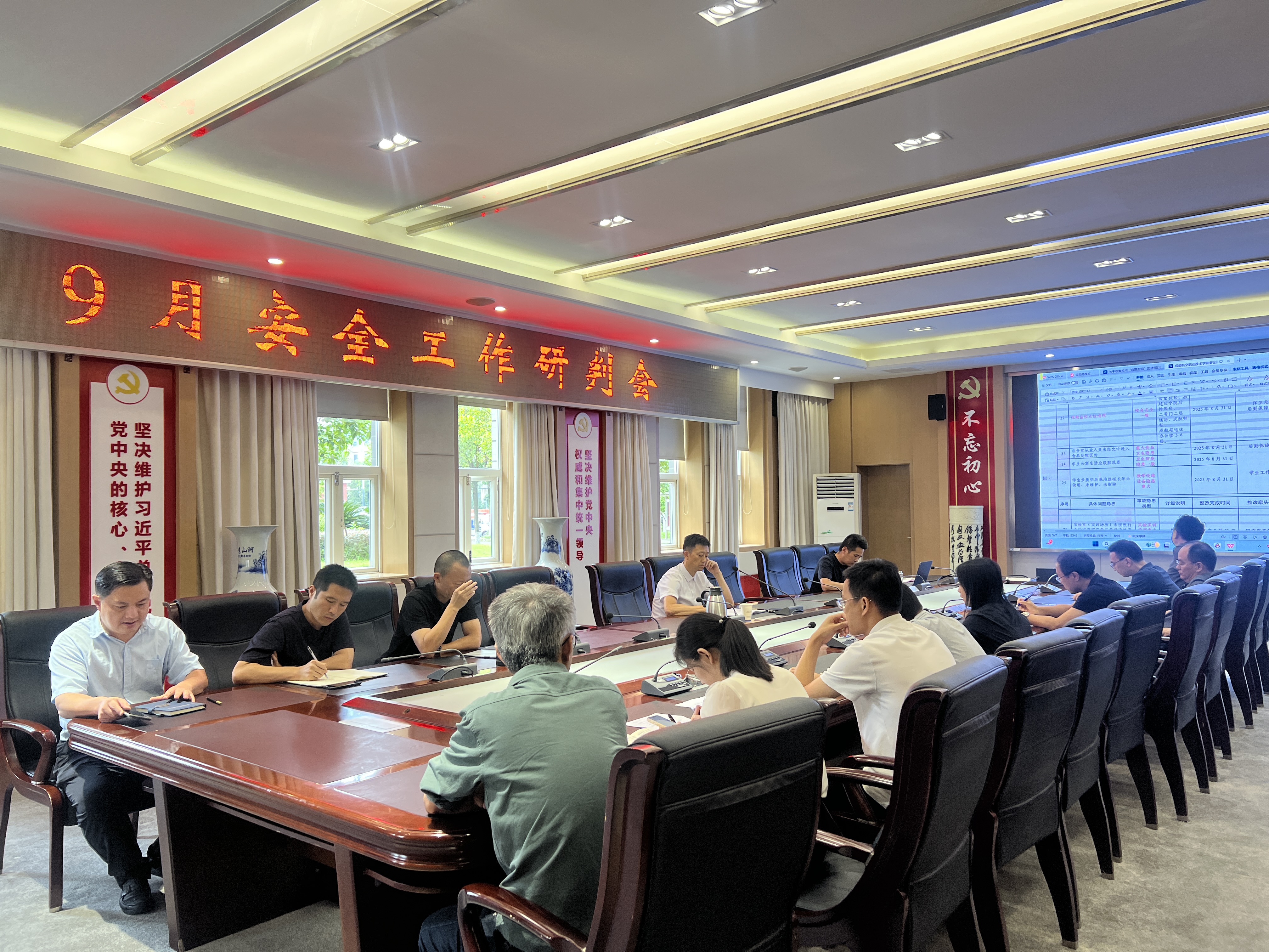 9月23日下午2时,成都航空职业技术大学9月校园安全工作研判会在行政楼第三会议室正式召开。会议紧扣校园安全关键领域,通过系统梳理近期安全工作情况,深入分析潜在风险隐患,持续巩固校园安全稳定态势。学校安全工作委员会办公室主任熊熙、副主任胡勇强,及意识形态、保密、教学等11个安全专项小组代表共同参会。