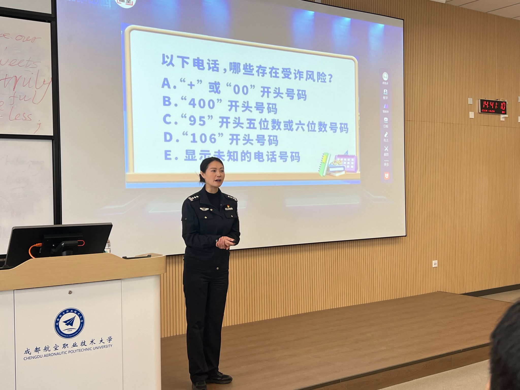 为进一步增强广大师生的防诈骗意识,提升对新型电信网络诈骗的识别和应对能力,全力营造平安和谐的校园环境,11月25日下午,新都公安分局张艺警官莅临我校,为师生们带来了一场生动而深刻的反诈宣传专题讲座。
