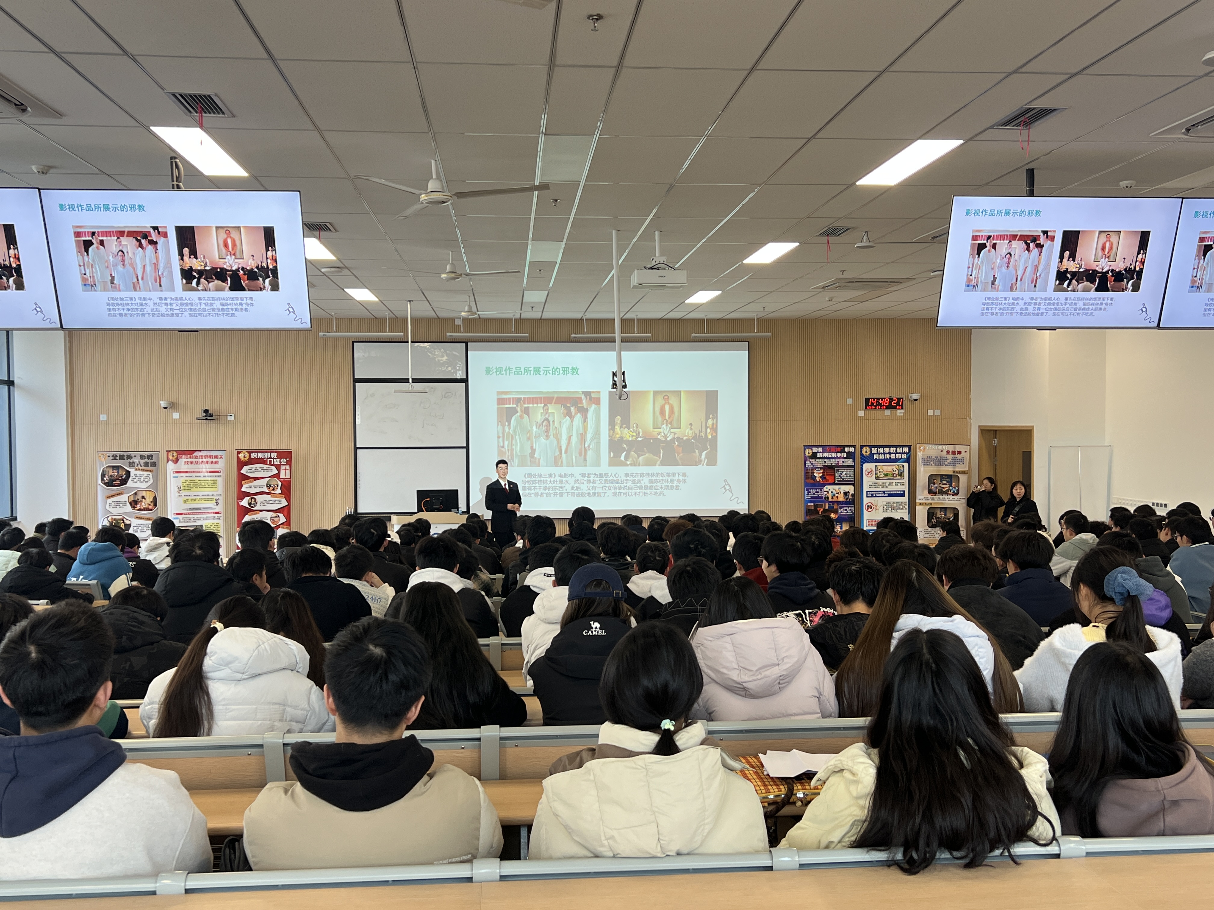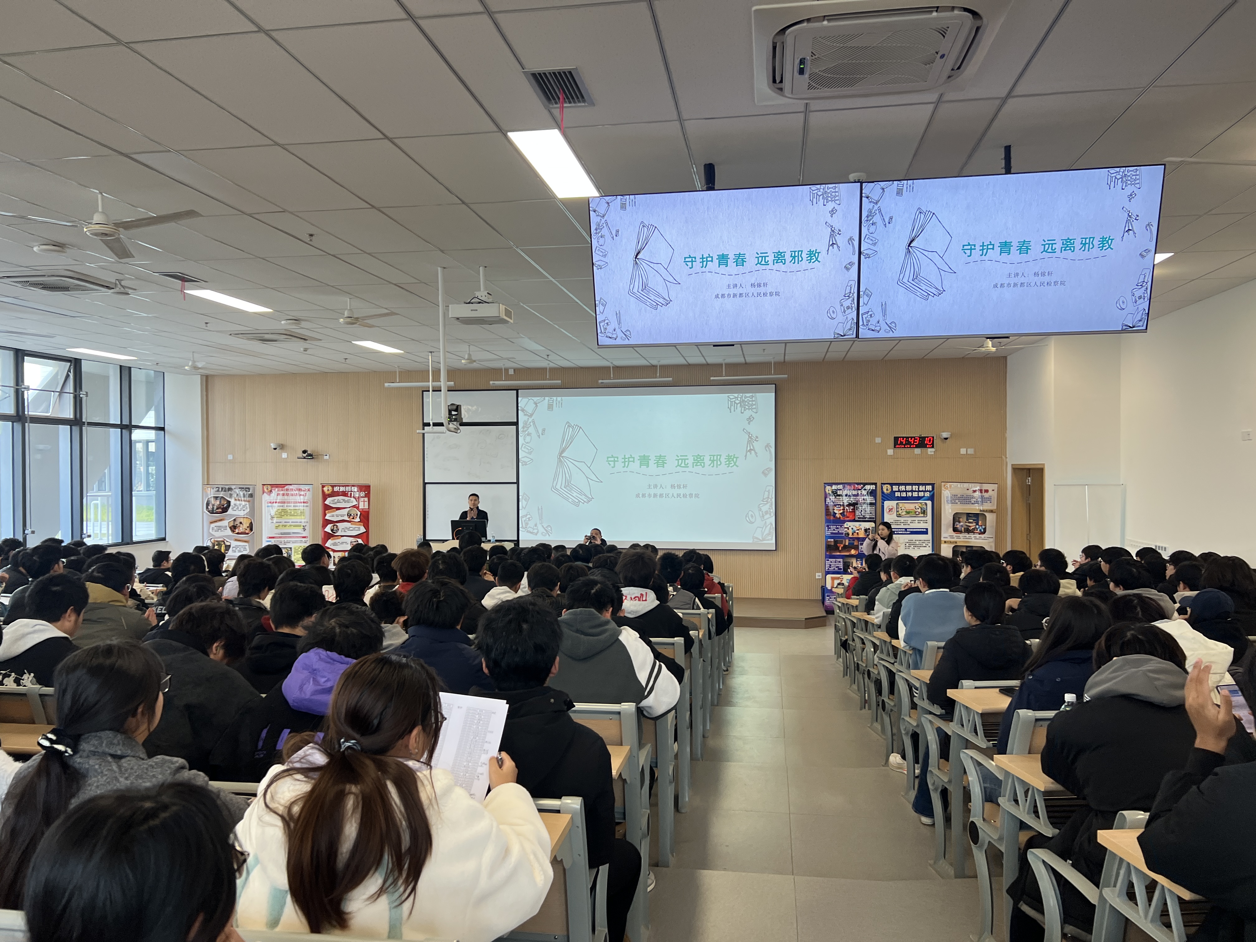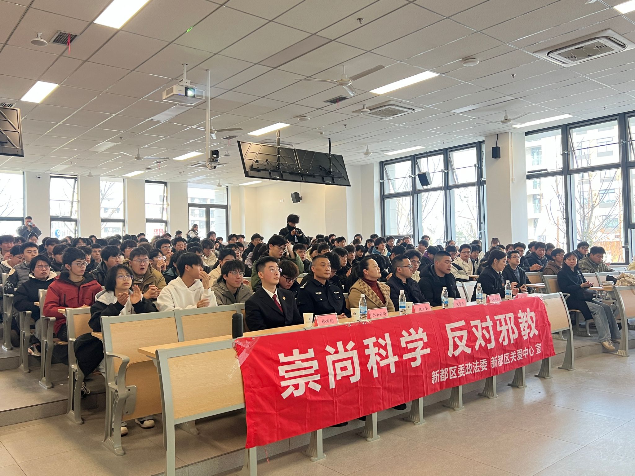 为增强高校学生防范邪教意识,筑牢校园安全防线,新都区反邪教警示教育宣讲团12月16日下午走进成都航空职业技术大学(新都校区),举办“守护青春,远离邪教”主题讲座。活动由校保卫处工作负责人李扬主持。
