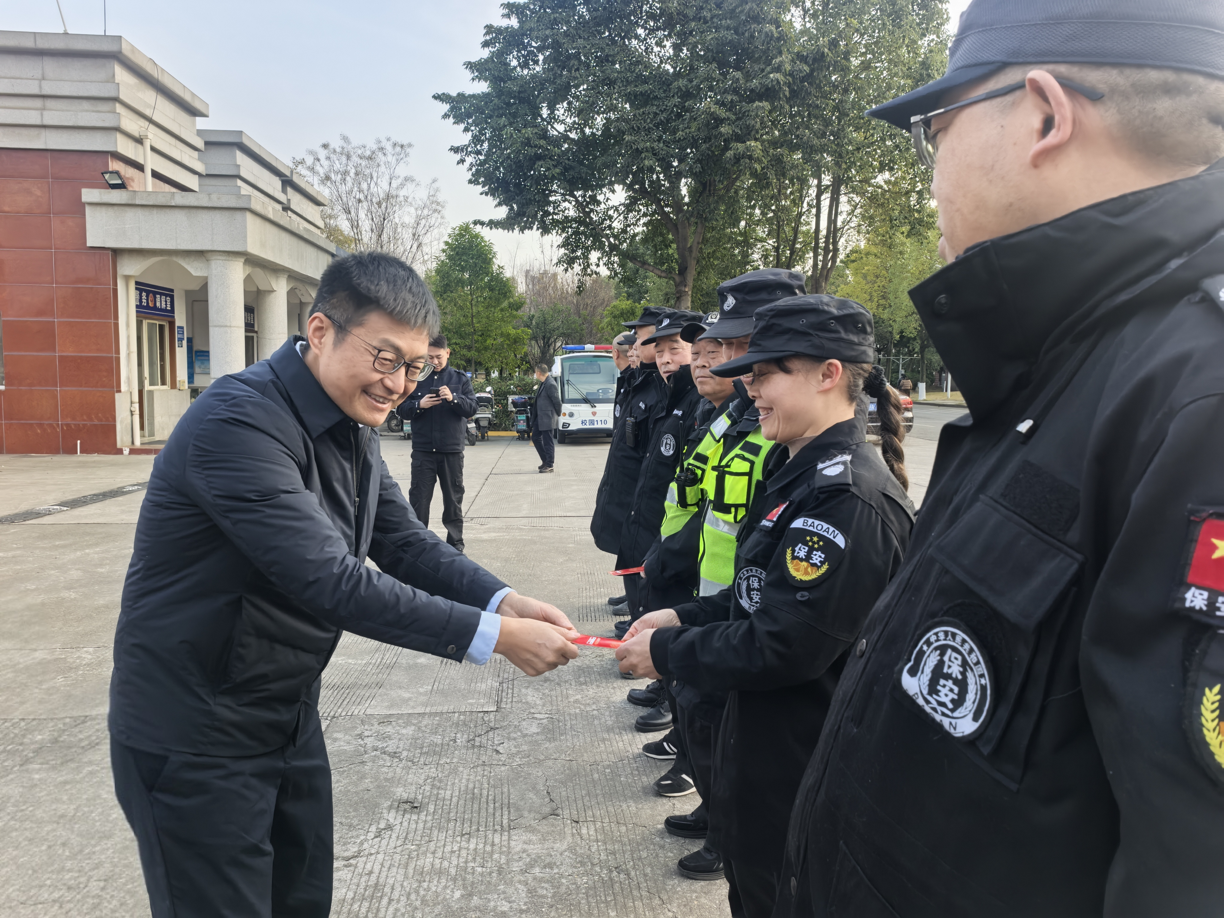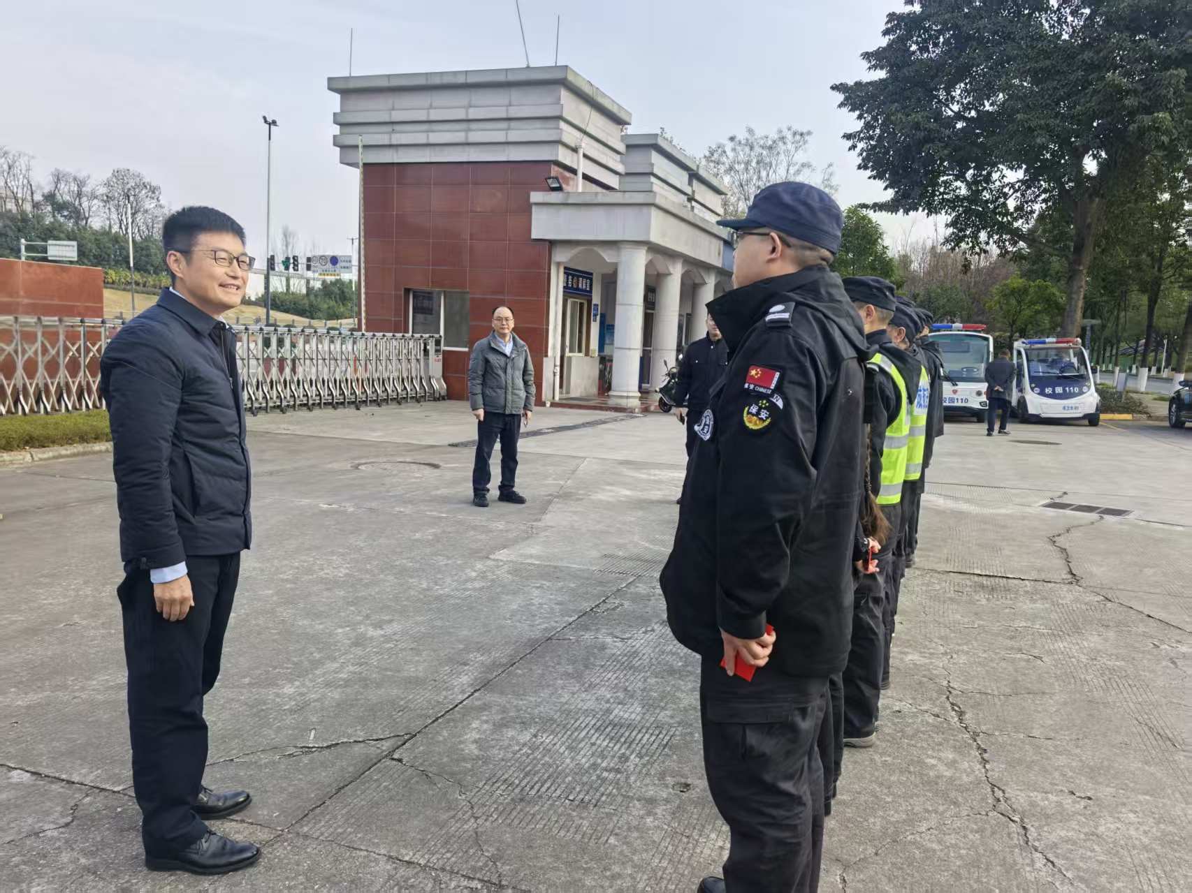 侯孟书校长带队走访龙泉校区各安保岗位,向坚守在一线的保卫人员致以诚挚问候。在校区1号门值守点,他详细检查门禁管理、访客登记等安保措施落实情况,了解假期留校师生安全服务保障工作;在巡逻队值班室,他与工作人员亲切交流,致以节日祝福并送上新春礼包。他勉励大家在马年新征程中继续保持昂扬斗志,紧盯校园安全重点领域和关键环节,持续提升安全防范能力和服务水平,以“马力十足”的干劲护航学校发展。