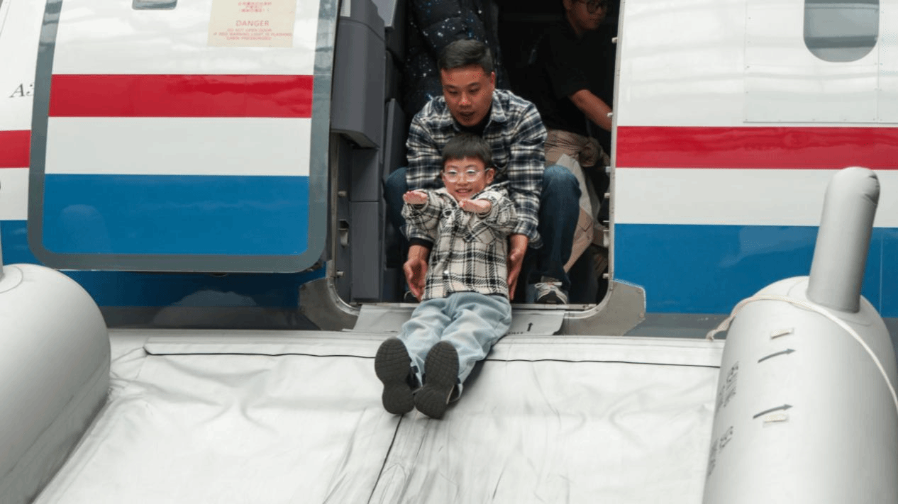 在民航基地体验中,学生们参与了飞行紧急情况应对及应急滑梯逃生演练。在模拟场景中,通过1:1模拟机舱与滑梯装置,让学生们在实操中掌握紧急情况下的逃生技能,强化安全防护意识,提升了应对突发情况的能力。