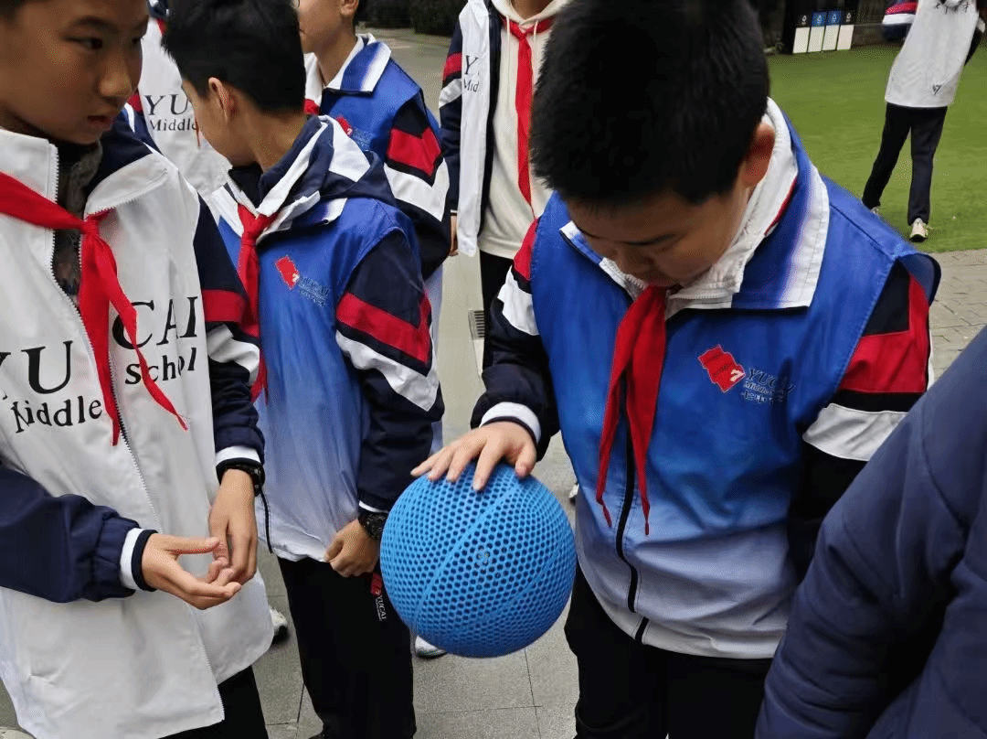 有人拿起蓝色的3D打印篮球掂了掂,好奇地问“这个能打吗?”,志愿者笑着解释:“这是用柔性材料打印的,不仅能拍,还能根据需求调整弹性哦!”