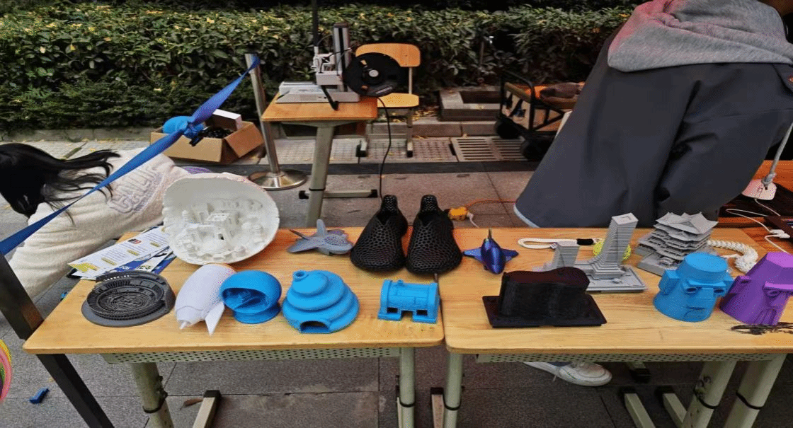 月球模型、航空摆件、镂空球鞋等3D打印成品整齐陈列,志愿者拿着一座微缩建筑模型介绍:“这些造型都是通过‘分层堆积’技术做出来的,像搭积木一样从无到有~”