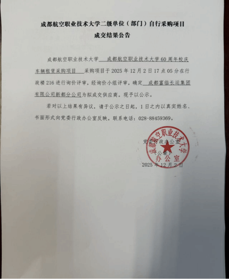 成都航空职业技术大学二级单位(部门)自行采购项目成交结果公告