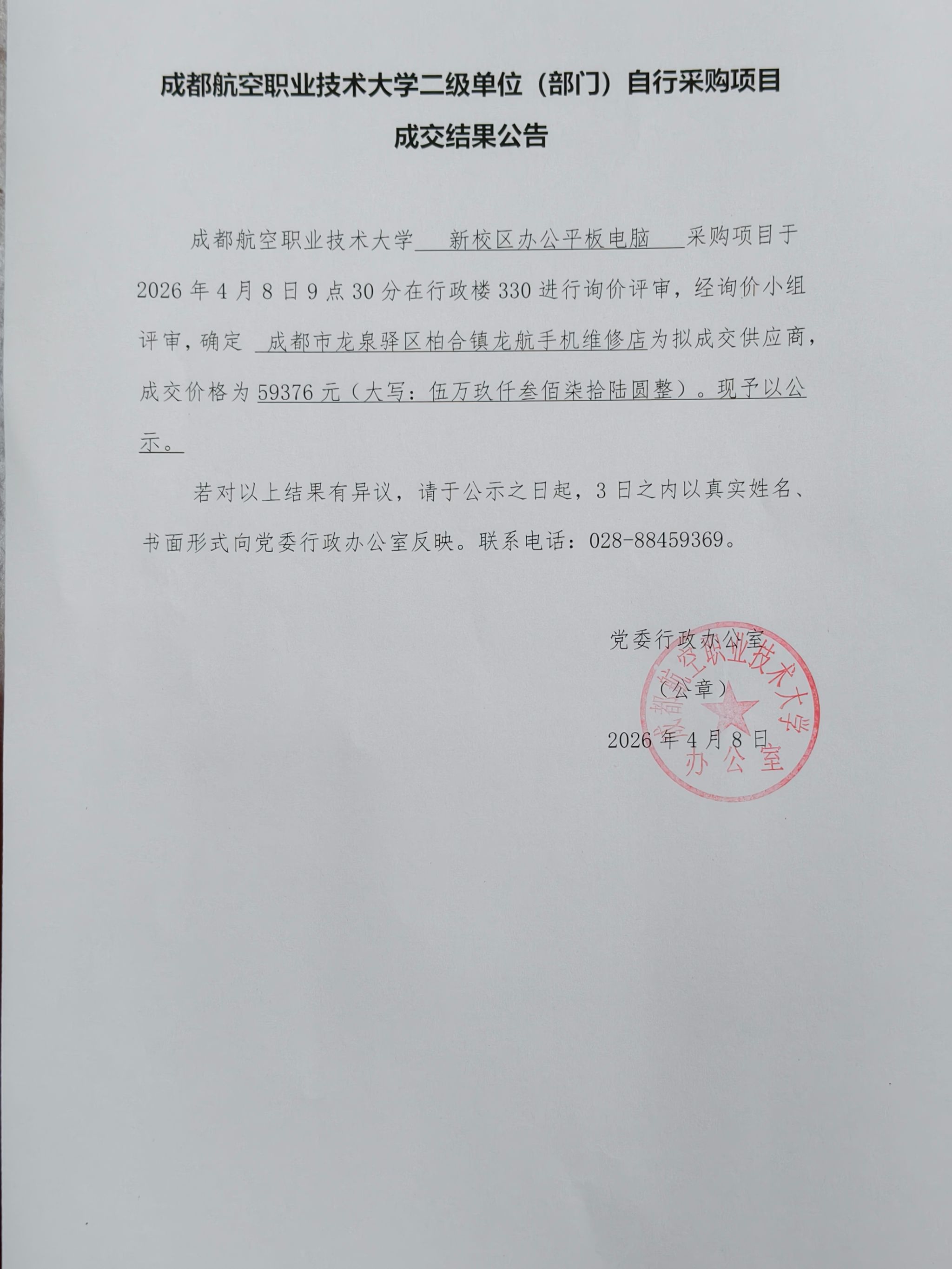 成都航空职业技术大学二级单位(部门)自行采购项目成交结果公告