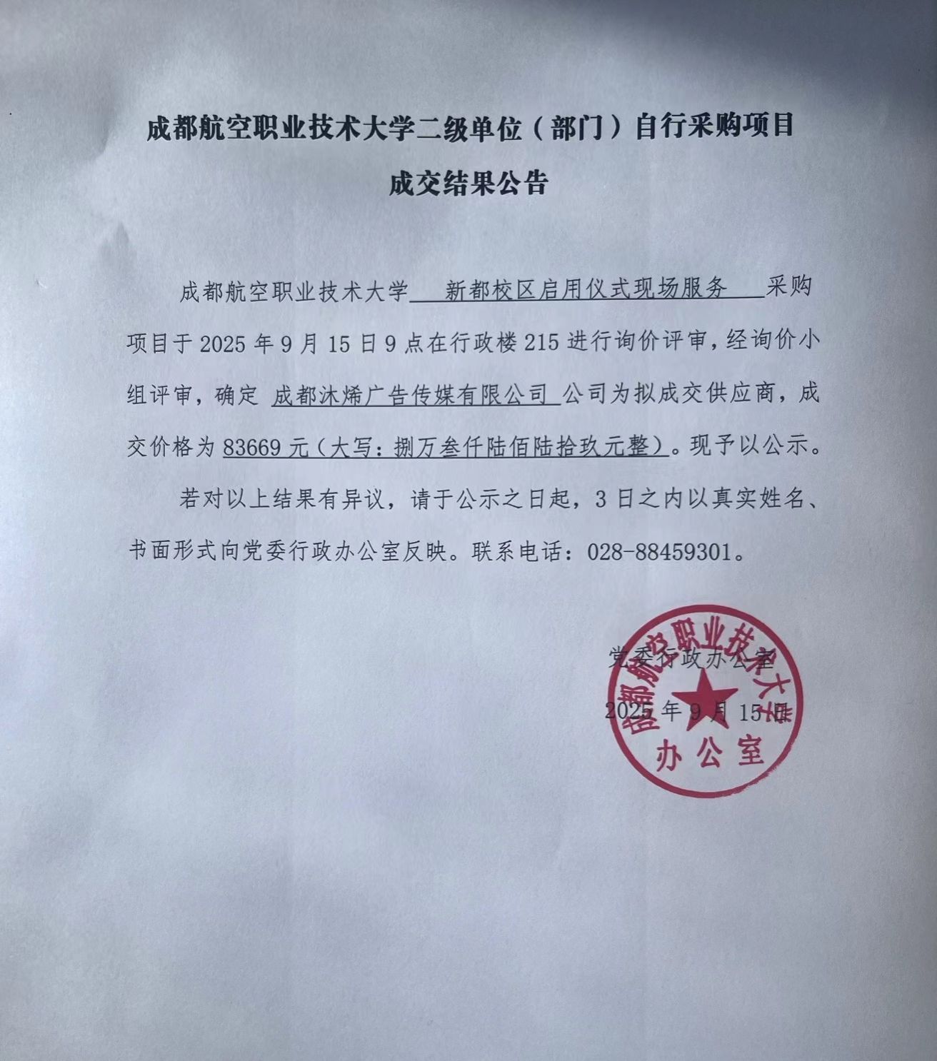 成都航空职业技术学院二级单位(部门)自行采购项目成交结果公告