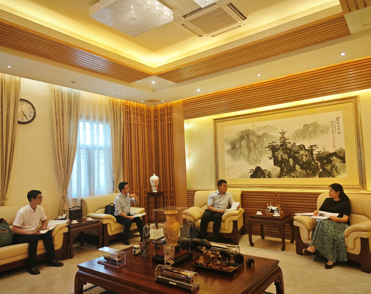 2024年11月20日,加蓬鲁班工坊建设团队成员与中航国际成套设备有限公司(简称中航国际成套)驻加蓬代表一同前往中华人民共和国驻加蓬共和国大使馆向王翠参赞汇报工坊的各项工作进展情况。