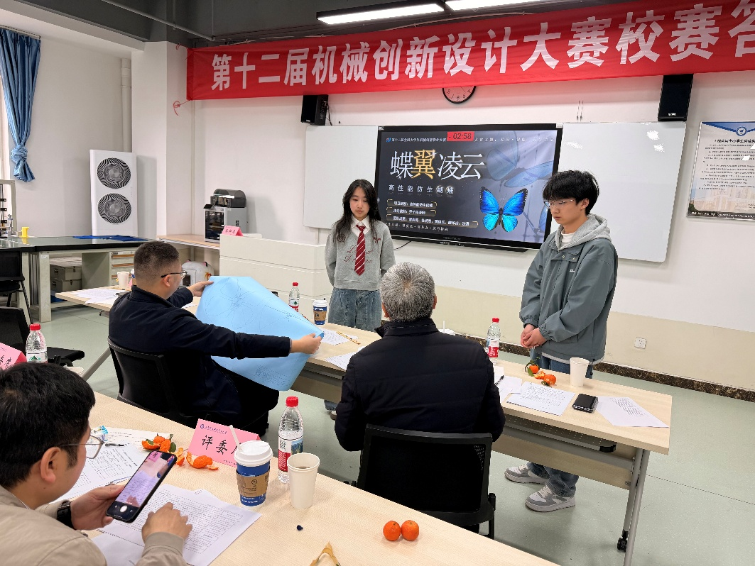 本次校内选拔赛共吸引了17支优秀参赛团队入围决赛。比赛现场气氛热烈,各参赛队伍围绕“特定水产品初加工机械”、“叶菜洁净化处理包装一体化机械”及“高性能仿生蝴蝶”三个指定方向,展示了他们在机械结构设计、智能控制及功能实现等方面的创新成果。图1所示为作品答辩现场。