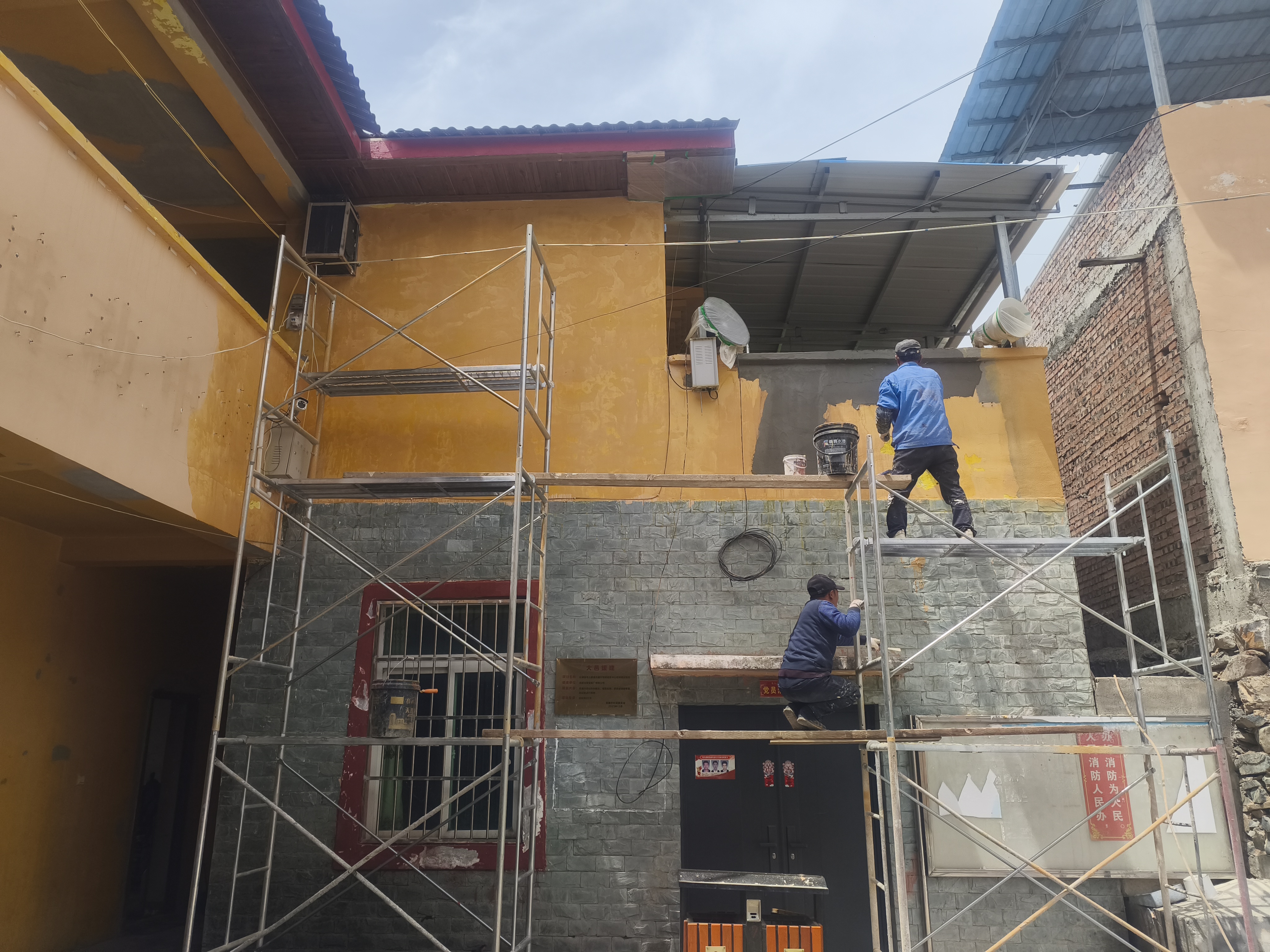 经过前期调研,本次共有800平方米以上的外墙需要进行喷漆翻新,同时,为了保证党群活动中心设备的正常工作,对相关广播设备进行了保护,同时对外墙破损处进行了维修。