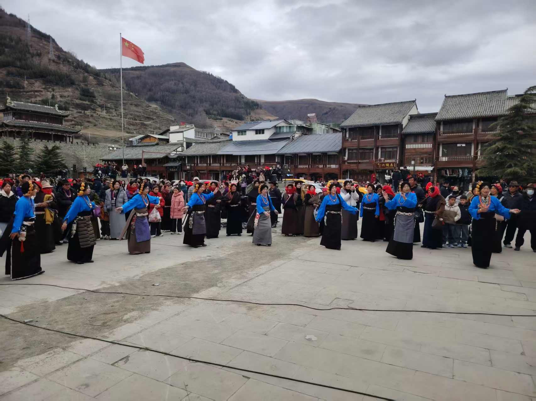 随后,在村妇女主任的精心组织下,身着节日盛装的妇女们热情洋溢地来到松潘古城广场。明媚的阳光下,伴随着悠扬动听的藏族音乐,大家手拉手,围成圈,踏着欢快的节奏载歌载舞。优美的舞姿、灿烂的笑容,充分展现了新时代藏族妇女积极向上、团结奋进的精神风貌,也吸引了众多古城游客和周边群众驻足观看,共同感受节日的喜悦与民族文化的魅力。
