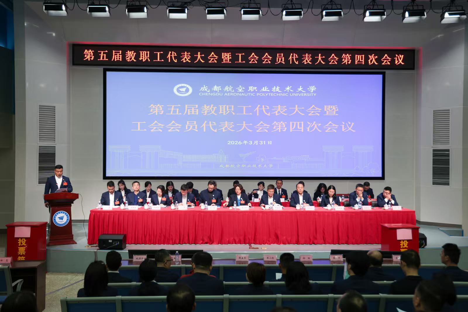 3月31日下午,第五届教职工代表暨工会会员代表大会第四次会议在成都航空职业技术大学(以下简称“成航”)博学楼笃行报告厅召开。与会代表齐聚一堂,凝心聚力,共同谋划学校发展蓝图。经过代表们积极讨论和认真审议,大会圆满完成各项议程和任务。学校党委书记陈小红、校长侯孟书、党委副书记、纪委书记徐林、党委副书记谢亮冯、副校长熊熙、副校长许丽佳、副校长许源源以及学校各单位(部门)的150名代表、58名列席代表和特邀代表参加会议。