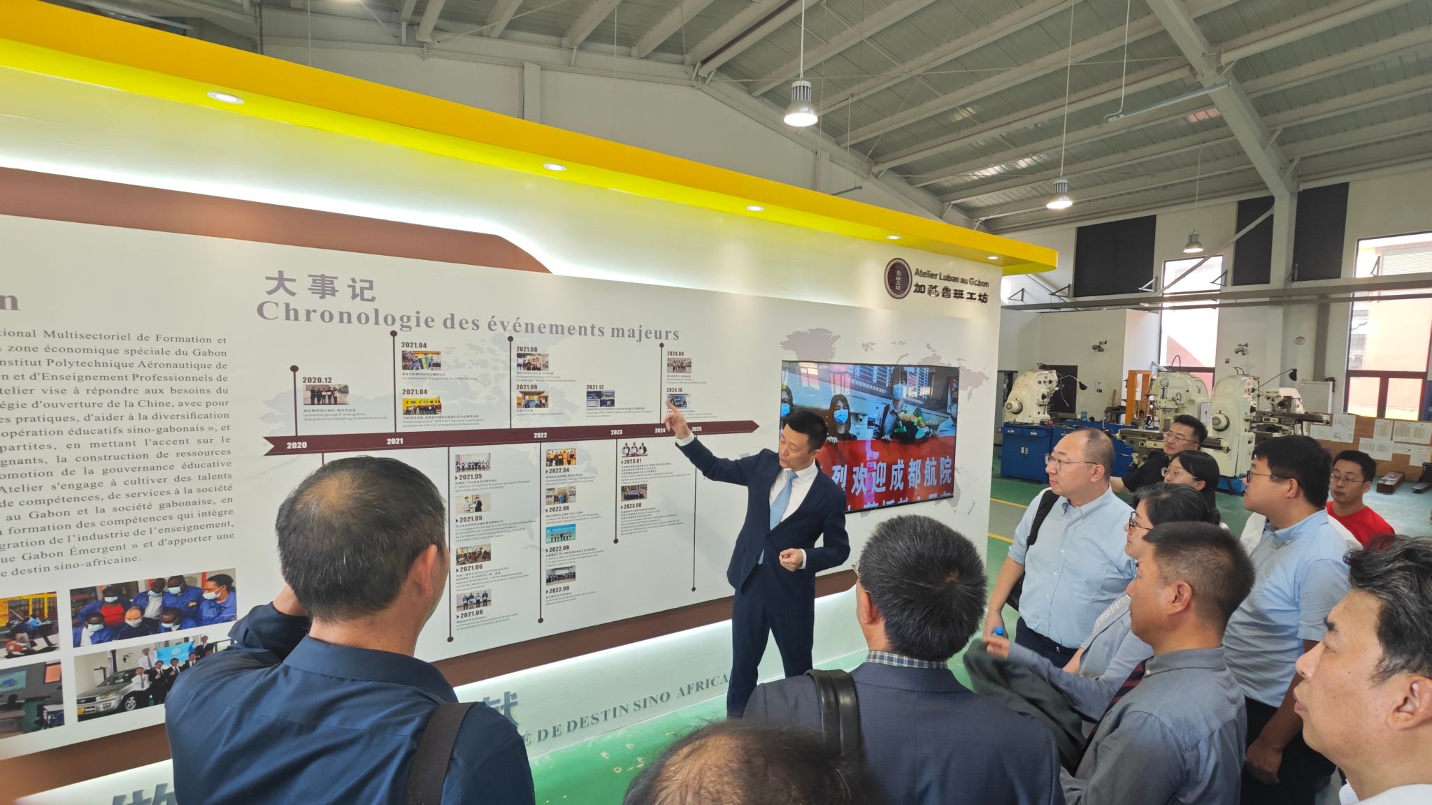副院长熊熙为到访人员讲解加蓬鲁班工坊建设情况