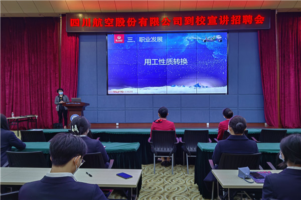 2022年10月13日下午,四川航空股份有限公司商务委员会纪委书记林红、人力资源部劳动关系管理室经理孙辉等一行来我校开展宣讲招聘会。此次川航宣讲招聘岗位为:客户服务代表岗位。招聘对象为我校2020级管理类和航空服务类毕业生,学校招生就业中心处长常春喜,管理学院党总支书记涂云友全程参与。