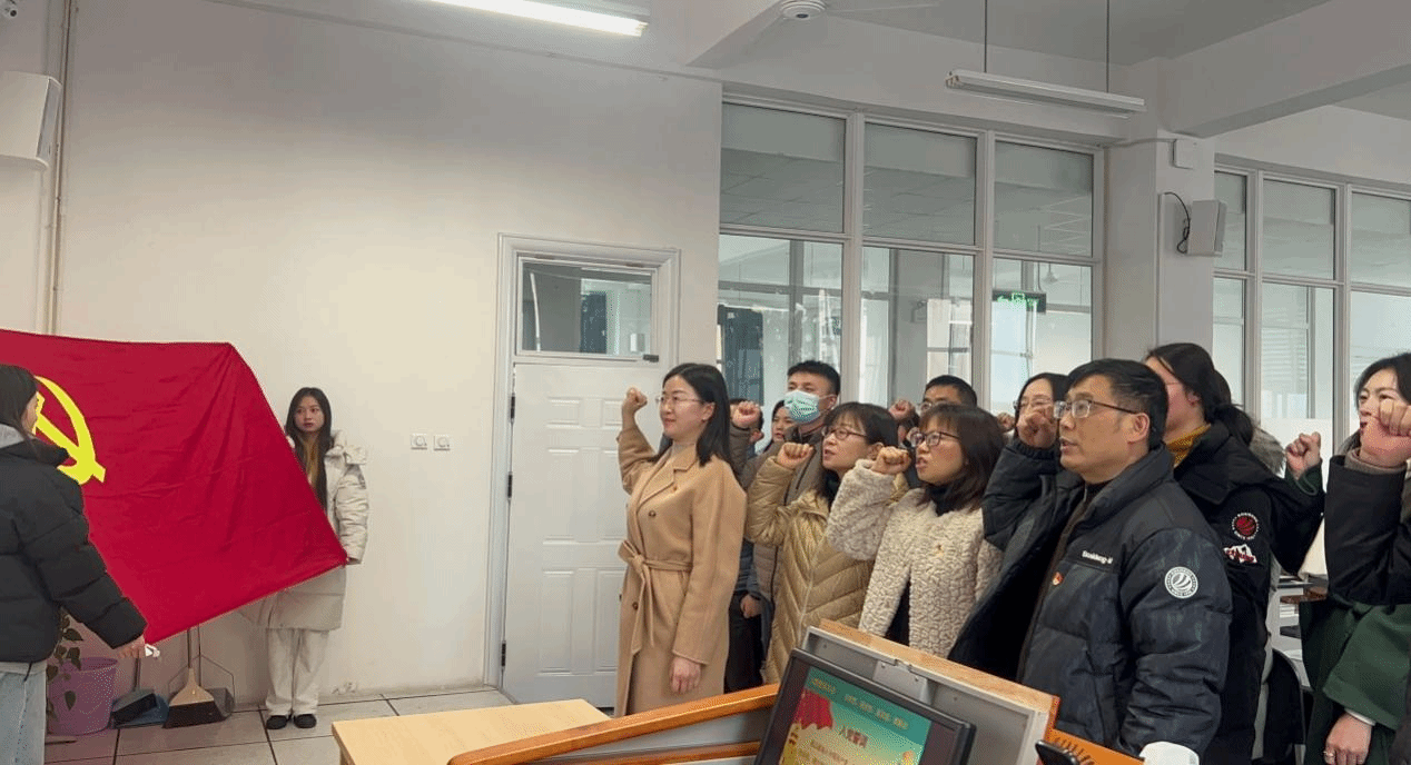 中心组成员与全体教师党员在504会议室集体观看《榜样8》。全体党员面向党旗重温了入党誓词。