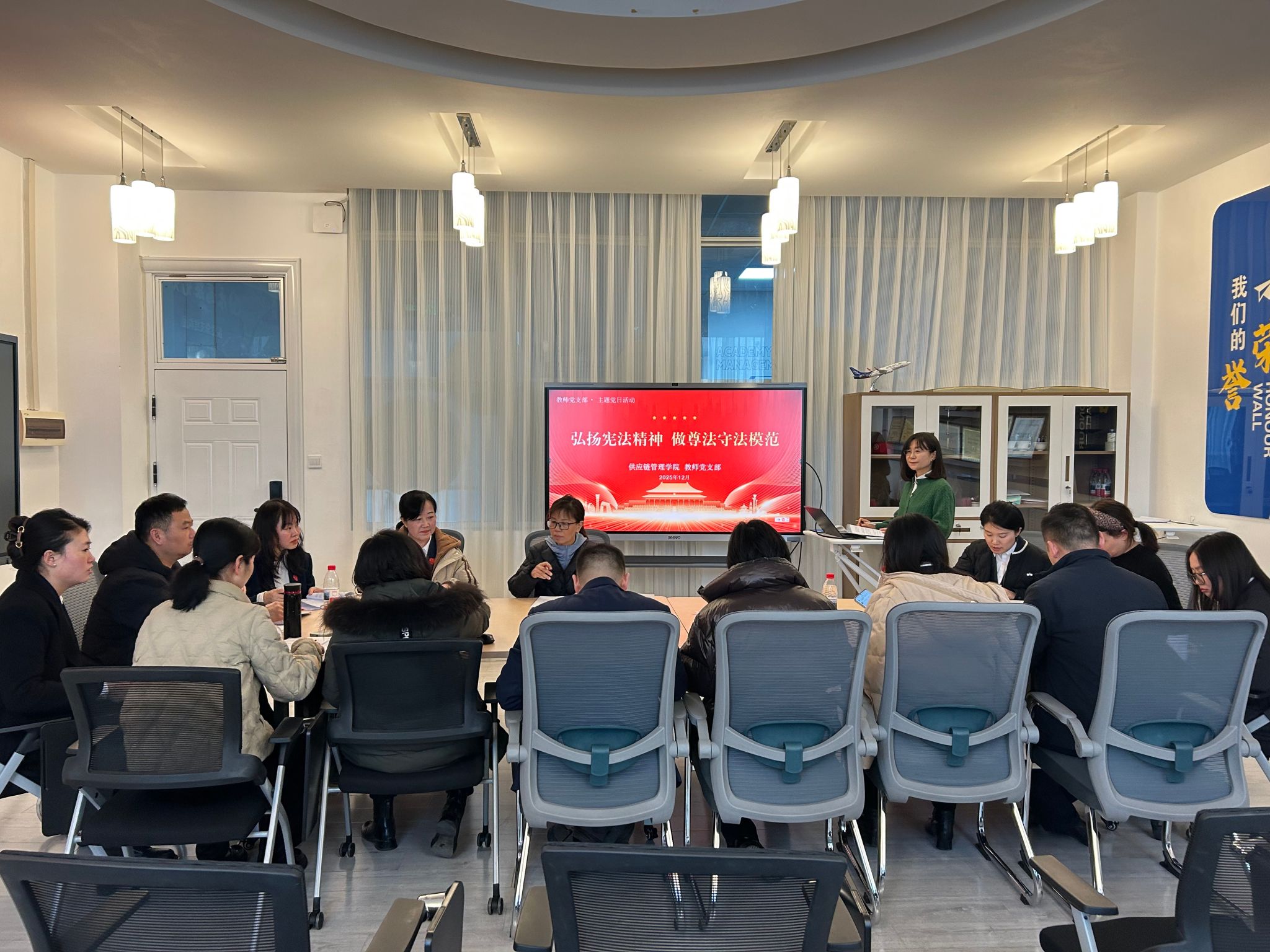 为深入学习贯彻党的二十大精神,进一步强化党员干部法治思维,弘扬宪法精神,供应链管理学院教师党支部于12月23日在知行楼504开展了“弘扬宪法精神,做尊法守法模范”主题党日活动。此次活动由教师党支部书记王娅主持,全体党员教师参加。