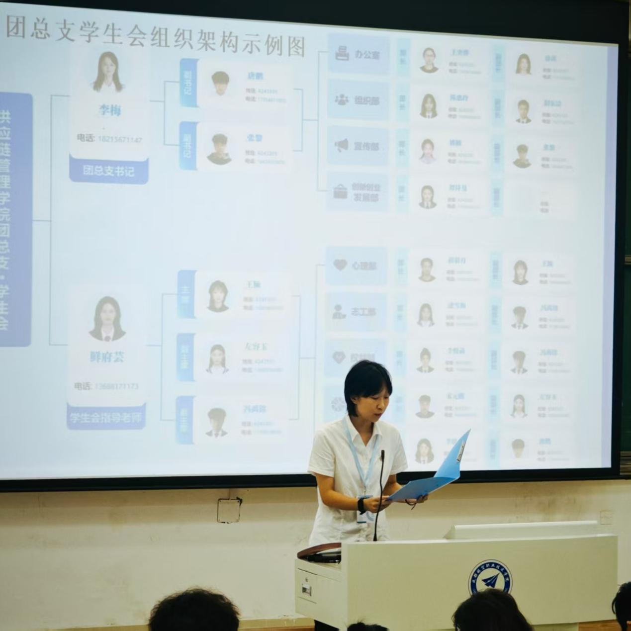 主席团代表在介绍团总支·学生会组织架构时,创新性地运用供应链管理思维,将各部门职能比作供应链上的关键环节。并就新学期的工作规划与展望进行了分享,明确了各部门职责与协作机制,为后续工作的顺利开展奠定了坚实基础。
