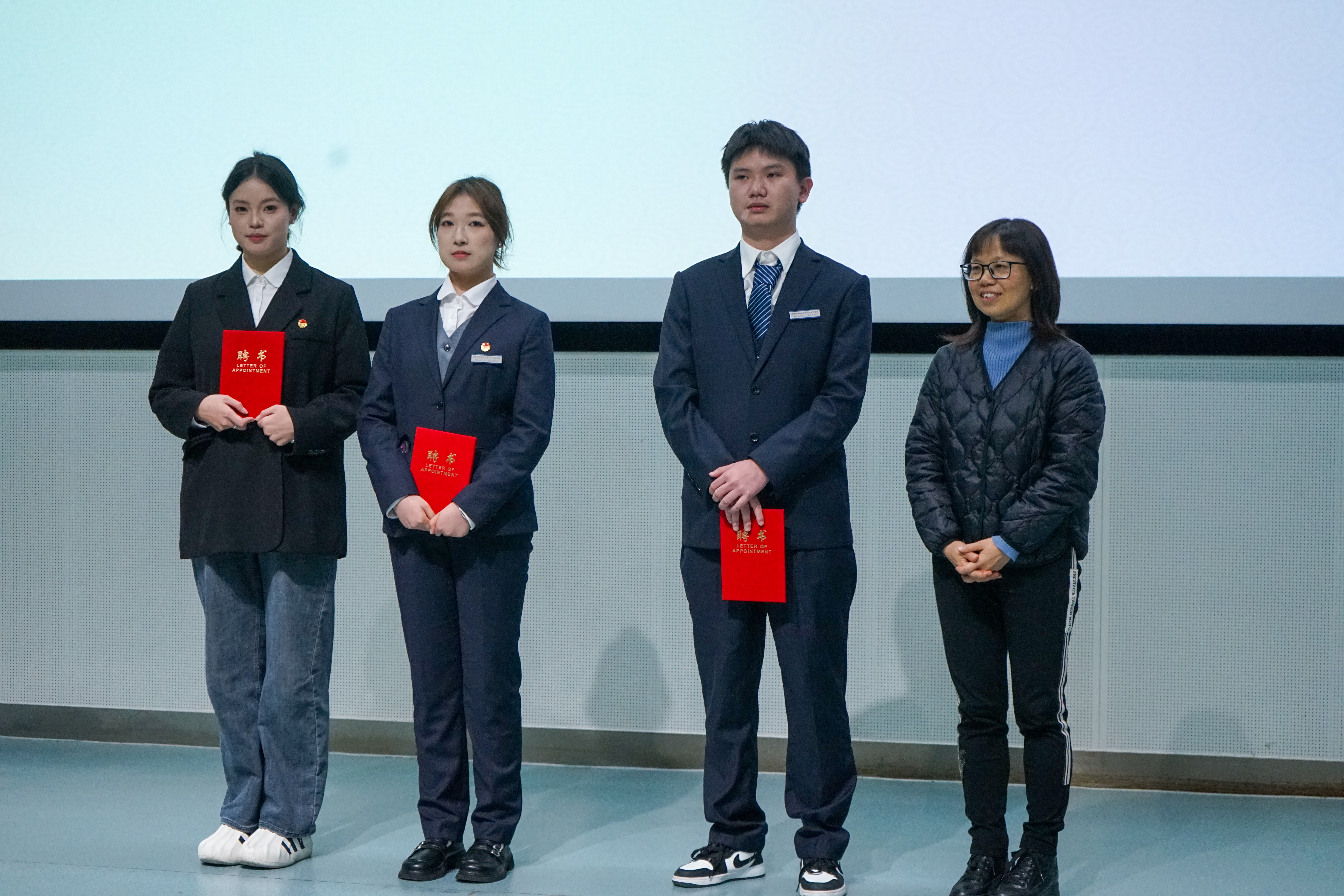 赖启财宣读第32届团总支·学生会干部名单,随后举行团旗交接仪式与新任干部授牌仪式。新一届团总支副书记冯禹铭、学生会副主席左容玉作就职演讲,表达履职尽责的决心。新生代表胡庆文发言传递新成员的热情与自信。