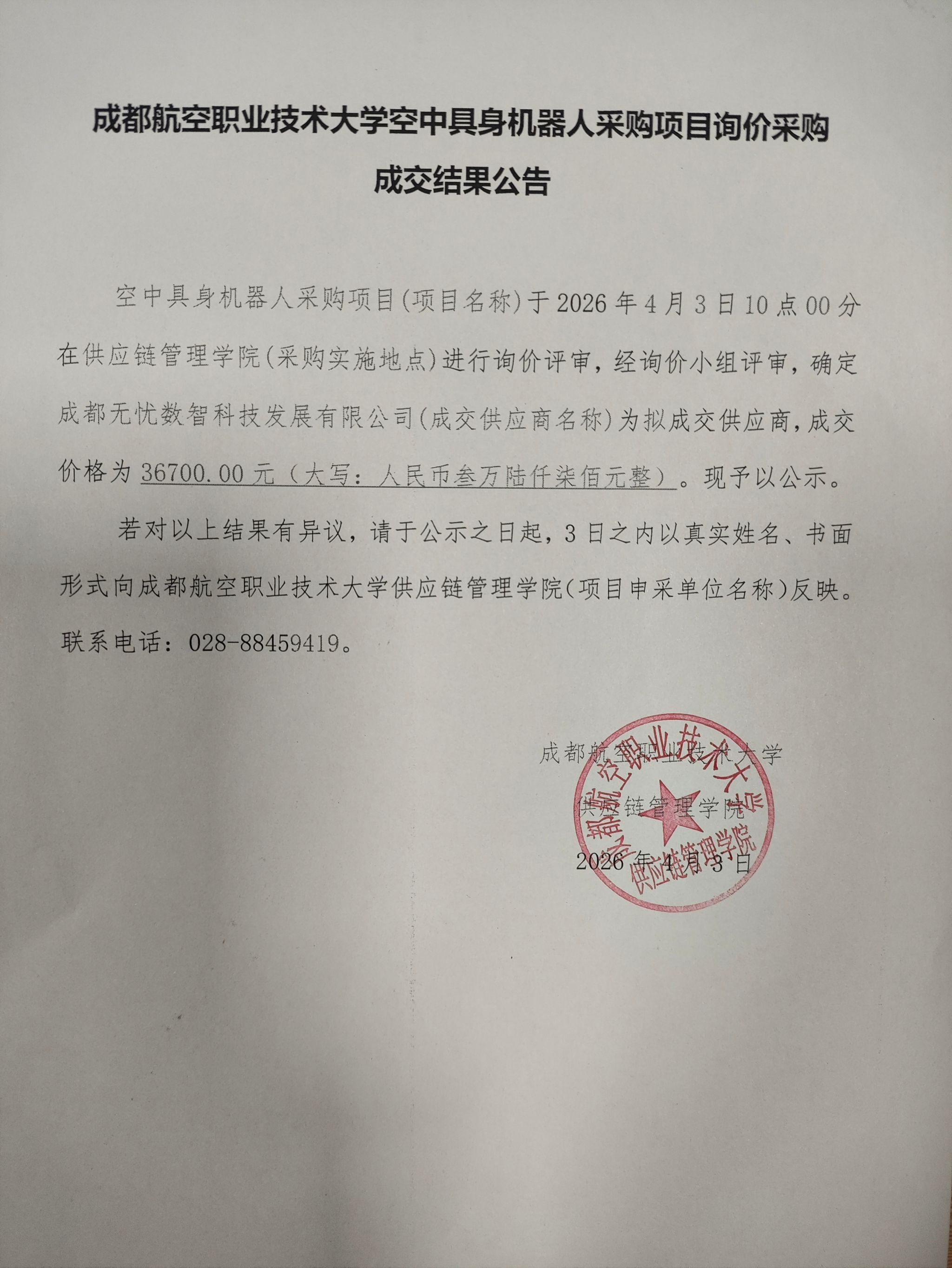 成都航空职业技术大学空中具身机器人采购项目询价采购成交结果公告
