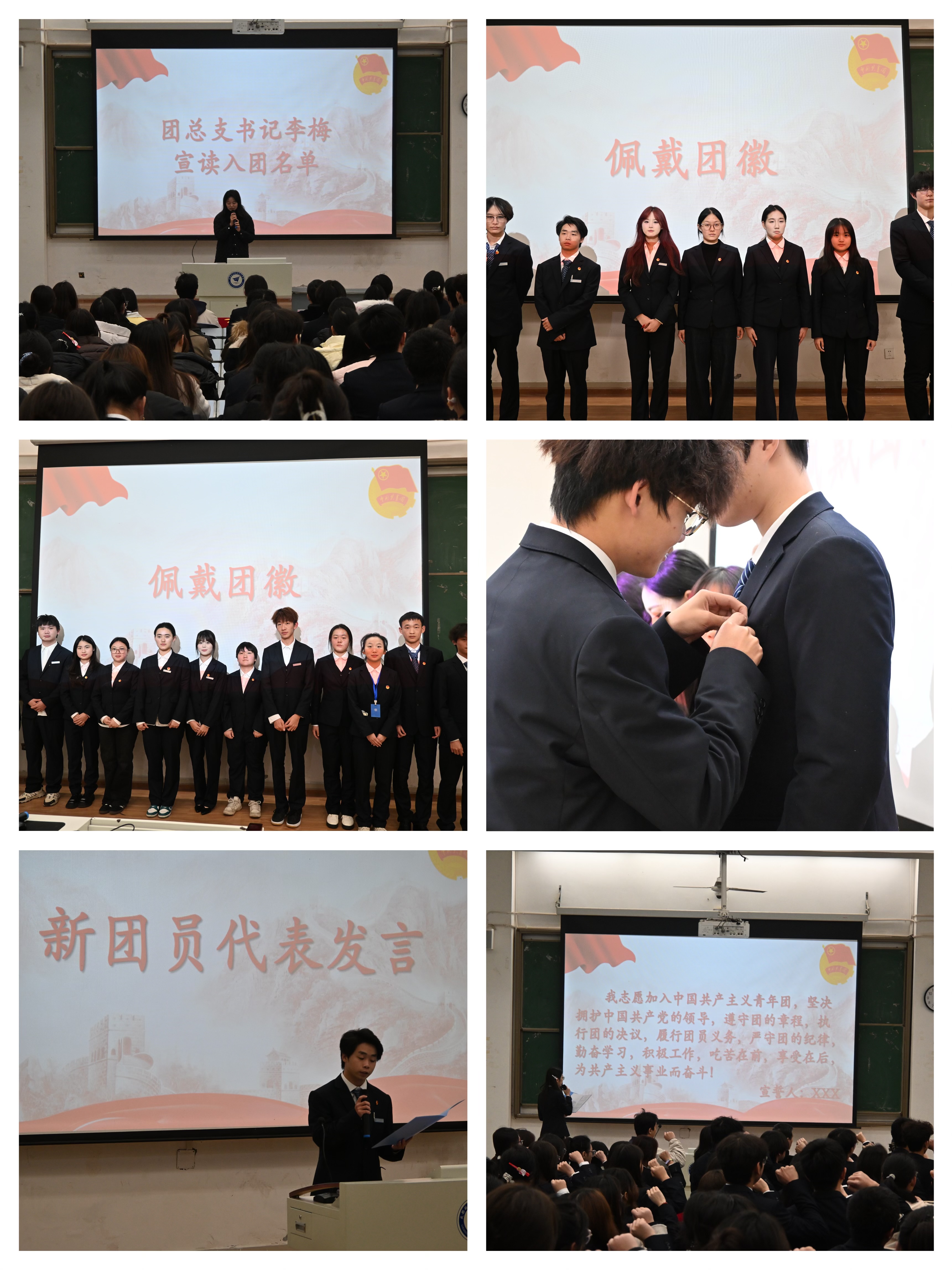仪式在庄严的氛围中拉开序幕。团总支书记李梅宣读了新发展团员名单,常思、崔一凡等15名同学正式加入中国共产主义青年团。随后,老团员代表为新团员佩戴团徽,金色团徽在胸前闪耀,象征着光荣与责任的传承。在鲜艳的团旗见证下,全体新团员肃立宣誓。领誓人带领大家许下坚定誓言,表达了永远跟党走、奋进新征程的理想信念。新团员代表罗安达发言,承诺将以实际行动践行入团初心,担当时代使命。