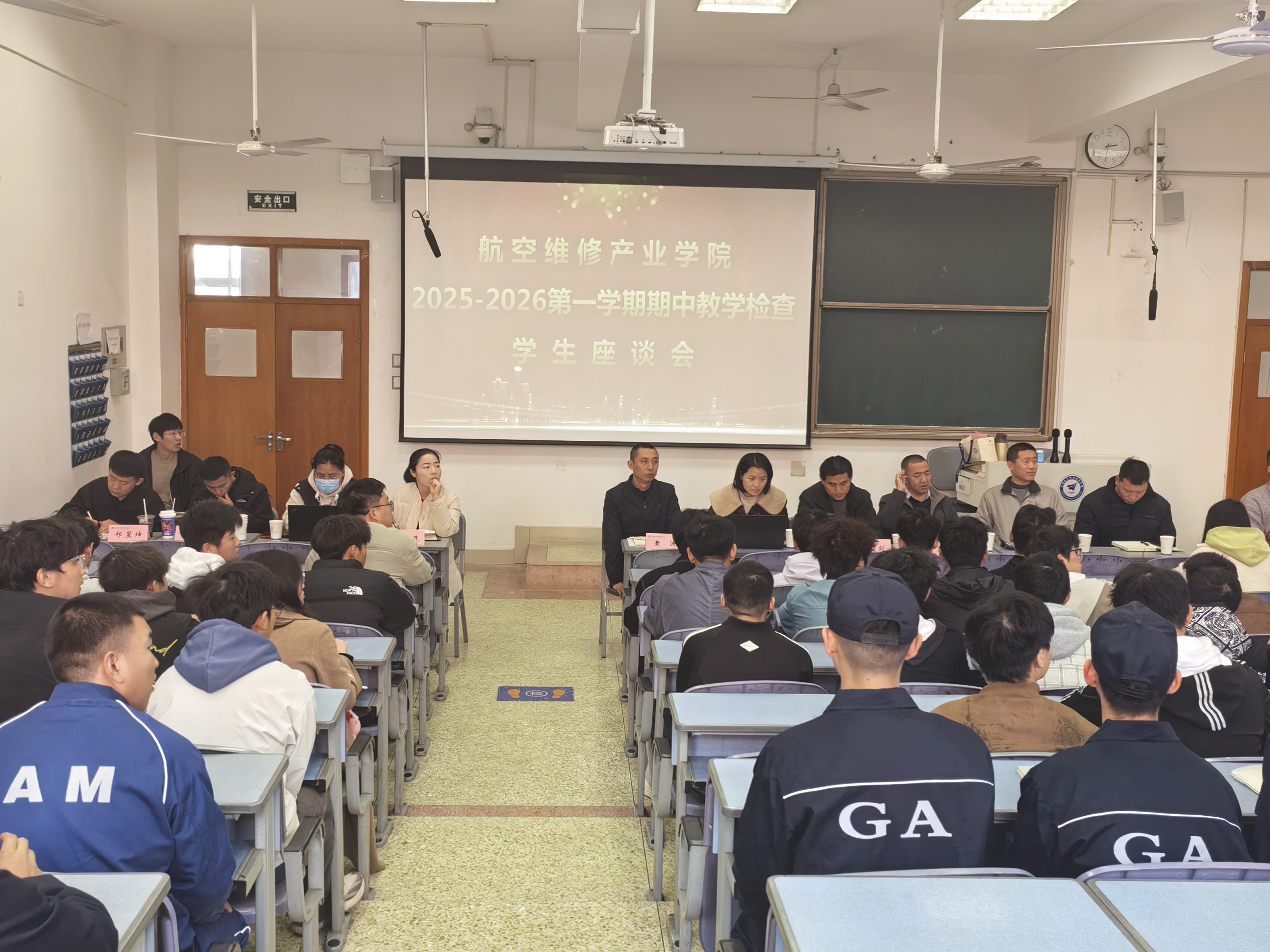 为深入了解学院教学运行情况,及时发现并解决教学过程中的问题,切实提升教学质量、加强学风建设,促进师生间沟通交流,11月25日,航空维修产业学院在尚学楼组织召开了2025-2026学年第一学期期中教学学生座谈会。航空维修产业学院教学负责人葛剑、军士管理学院行政负责人梁潘、各专业教研室主任、教师代表,以及学院各班学生代表、军士管理学院相关专业班级学生代表共同参会。