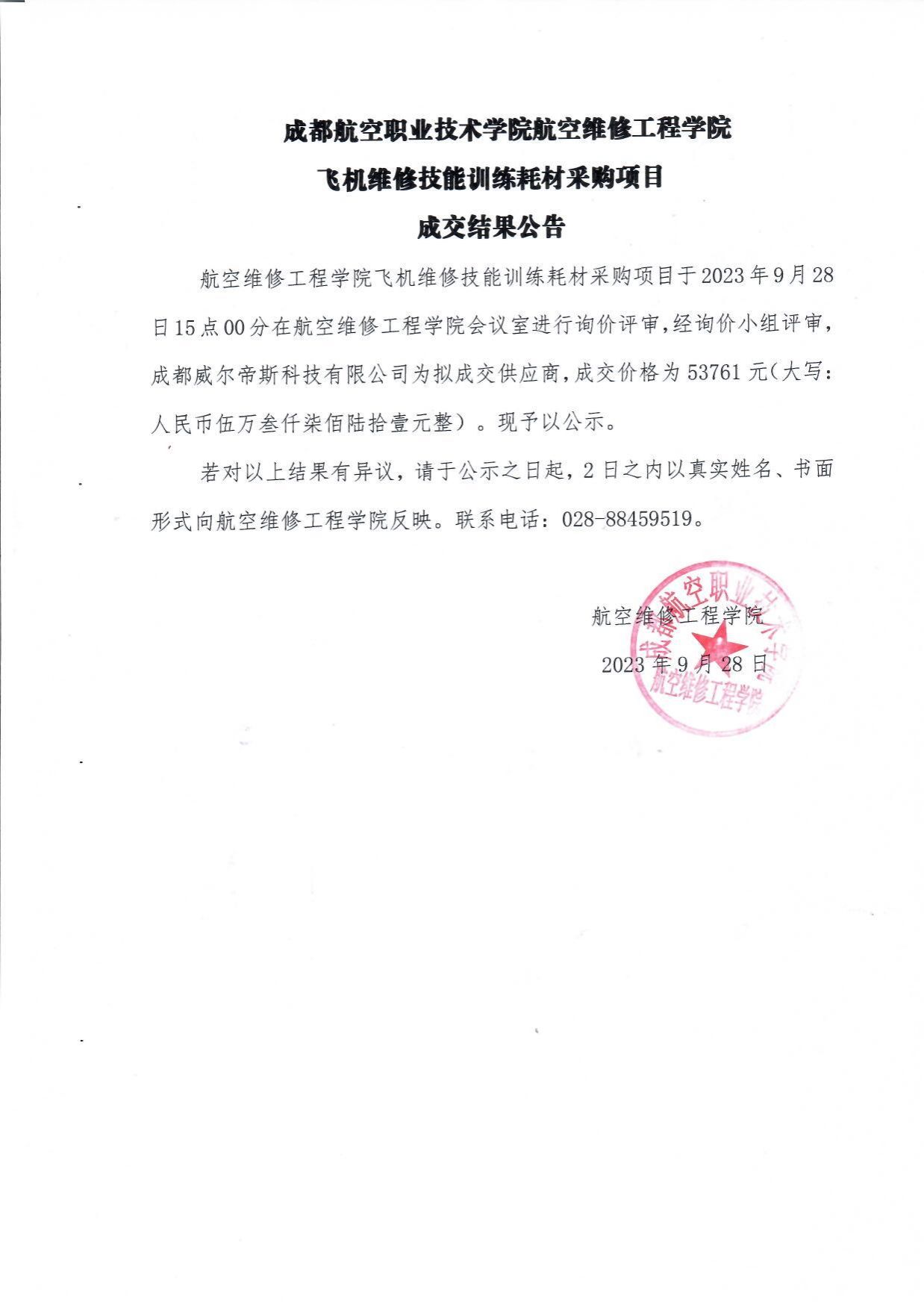 成都航空职业技术学院航空维修工程学院飞机维修技能训练耗材采购项目成交结果公告