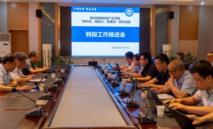 聚焦“转作风、提能力、抓落实”工作大落实,2022年6月16日下午,航空装备制造产业学院在行政楼三号会议室召开“转作风、提能力、抓落实”活动转段推进会,听取人事教师处、教务处、科技处等职能部门对学院的意见后查摆问题。人事教师处处长任丹、教务处处长袁忠、科技处处长李明富、航空装备制造产业学院领导干部和各教研室主任参会。