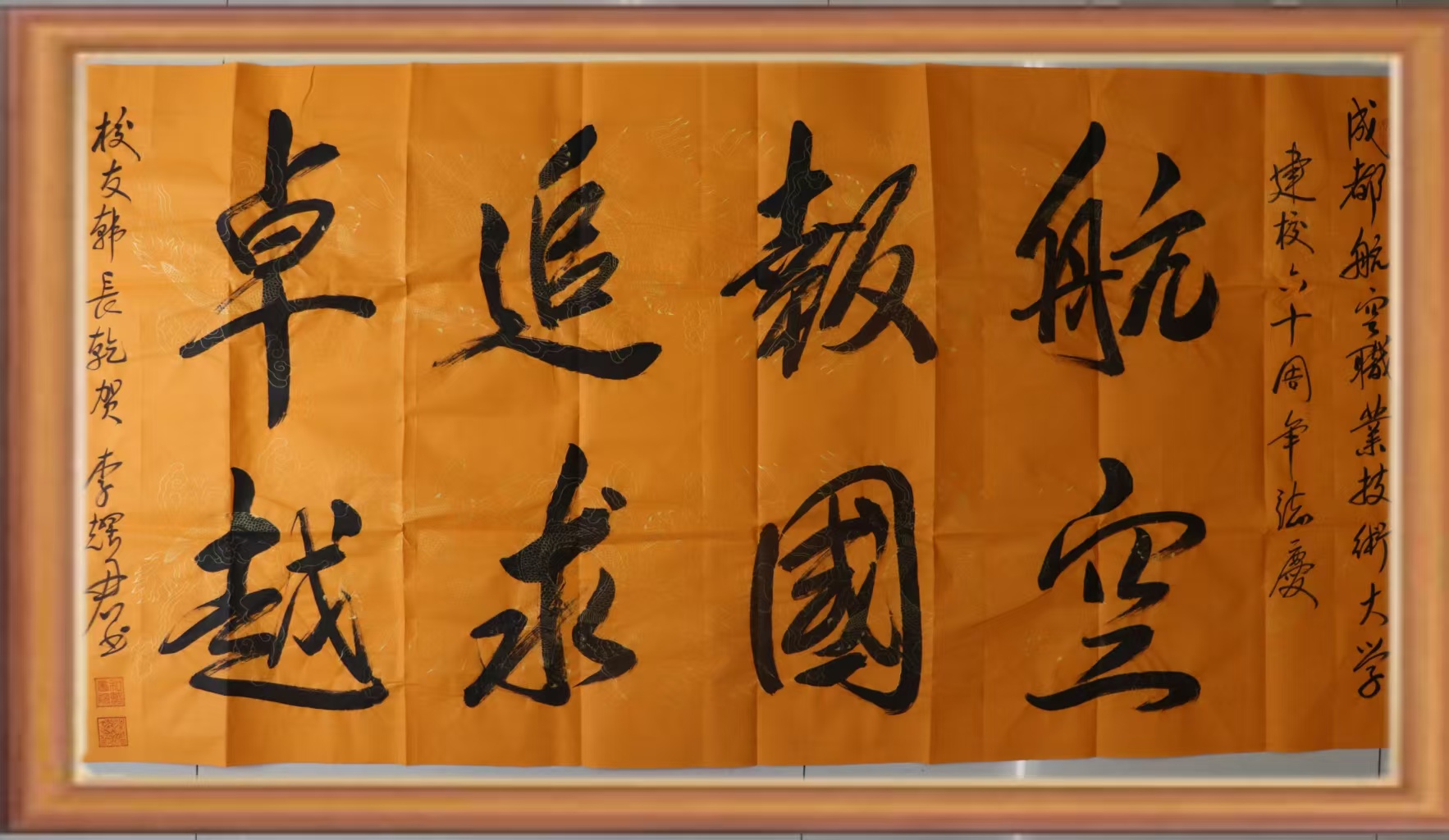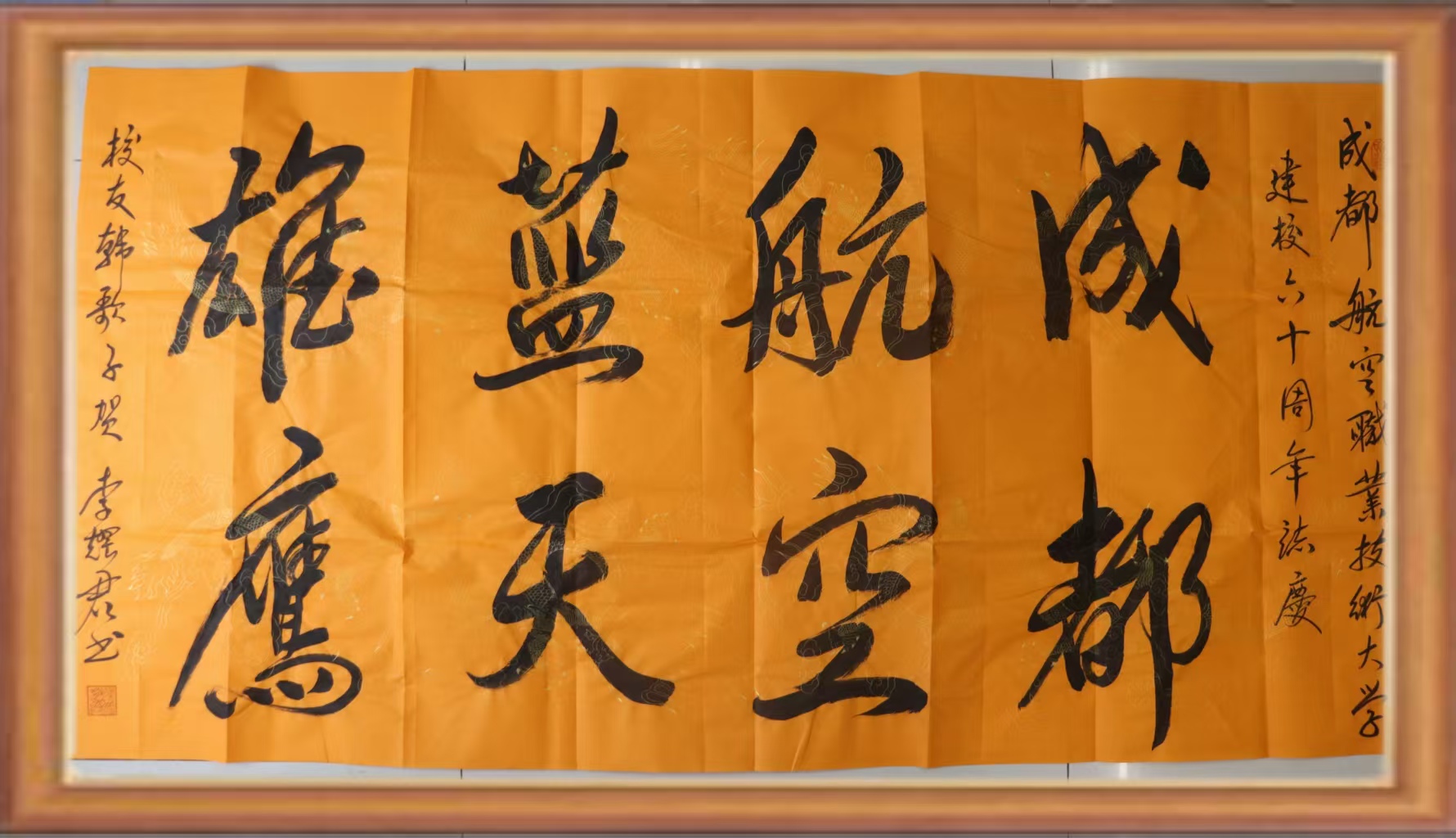 六十载栉风沐雨,一甲子桃李芬芳。8402班校友韩长乾携书法作品“航空报国 追求卓越”“成都航空 蓝天雄鹰”“航空报国” 回归母校,为学校 60 华诞送上最真挚的贺礼。