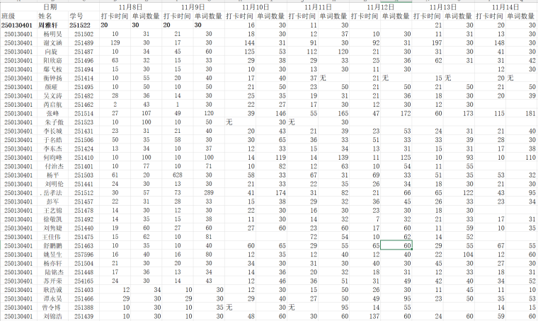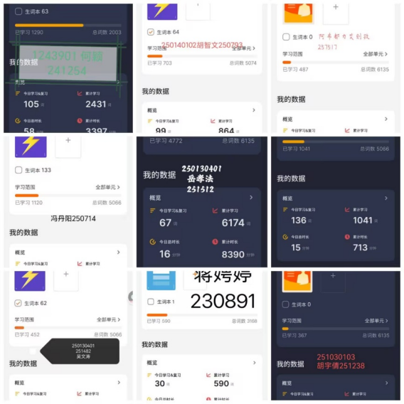 活动开展期间,同学们以高度的自律性积极投身其中,不仅严格遵循打卡时间节点,每日准时上传打卡截屏,更以认真严谨的态度对待学习内容,逐词落实记忆与拼写任务,按质按量地完成每日量化要求。从初期的适应摸索到后期的习惯成自然,大家在循序渐进的积累中稳步提升词汇储备,学习部的每日登记备案也为同学们的坚持提供了有效监督,让整个打卡过程规范有序、成效显著。