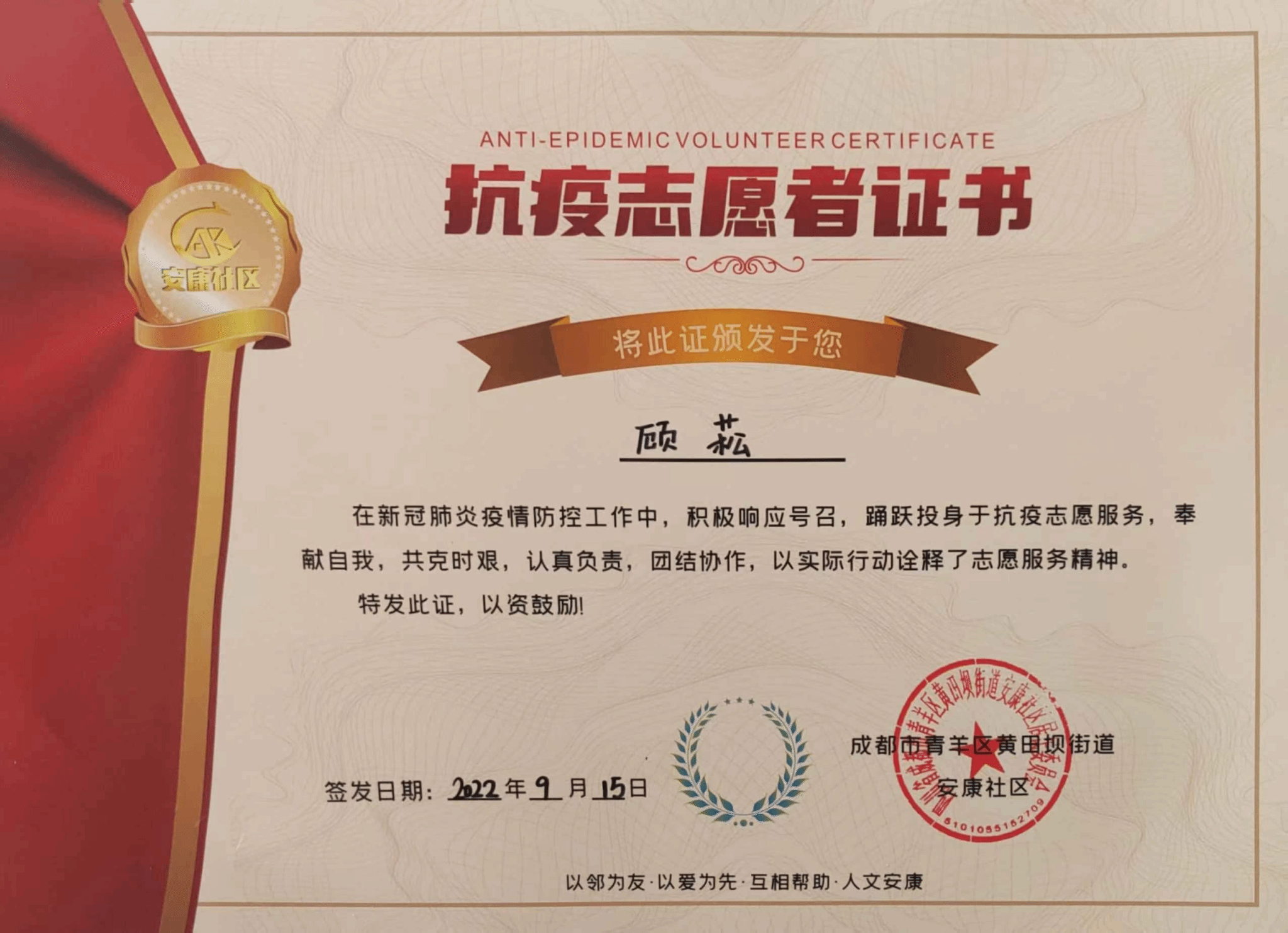 褪去“园丁”外衣,装备学院自动化教研室的中共党员顾菘老师勇敢直面疫情锋芒。9月9日至9月17日顾老师参加了成都市青羊区黄田坝街道安康社区的核酸录入志愿服务工作。同社区一线工作人员并肩作战,全程配合核酸检测工作,迅速化身为引导员、扫码员、宣传员,认真完成了秩序维护、引导协调、讲解流程、扫码登记、流调排查、解答群众疑惑等工作,尽个人力量助力核酸检测工作高效、有序进行。