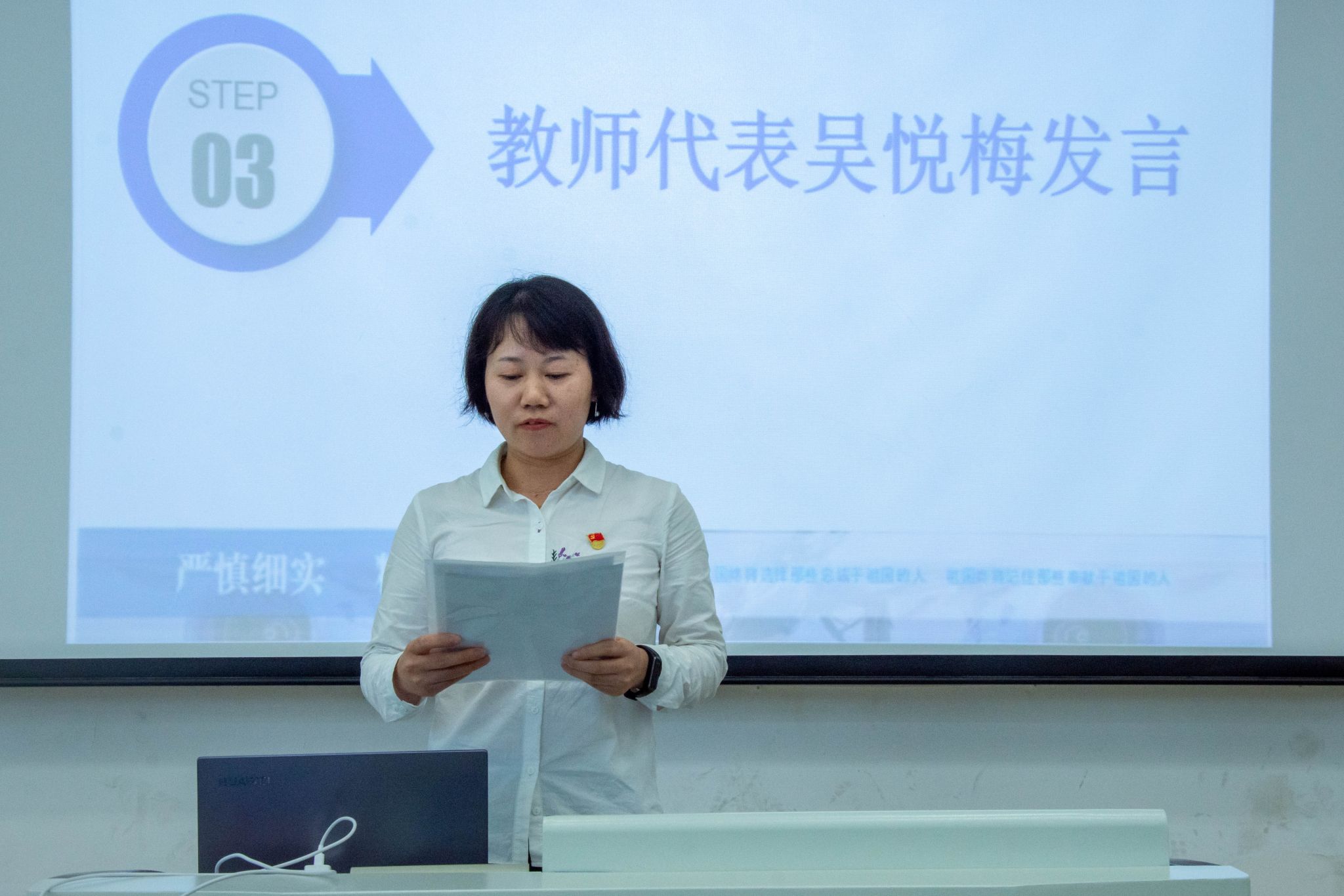 授牌仪式结束后,攻坚行动教师代表吴悦梅进行了表态发言,她提到双高计划对学院是机遇也是挑战,并以关于职业教育的三点切身感受,表达了对学院双高建设工作的坚定支持。