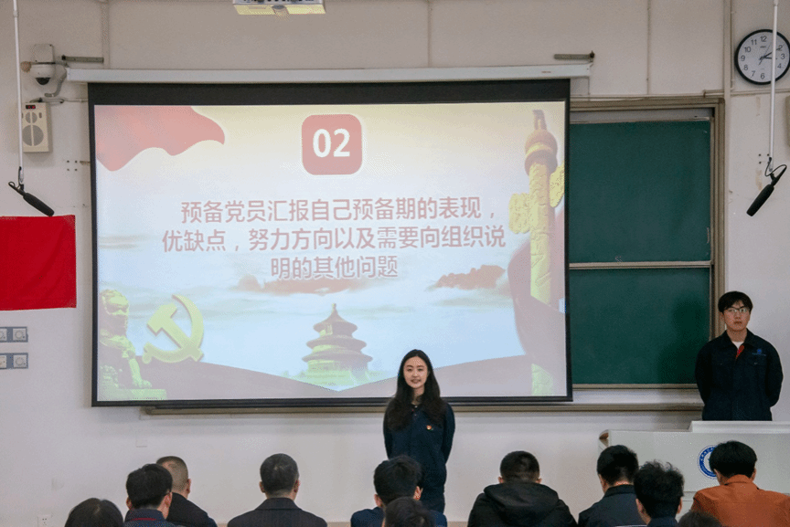 大会伊始,由王梦嘉宣布大会的流程、要求、以及报告应出席和实际出席会议的党员人数。首先由杨志豇等5名预备党员依次宣读转正申请书,汇报预备期间的表现和情况,认真总结自己在思想、学习、生活等方面的表现,找出自己的不足之处,同时表明今后努力的方向以及需要向党组织说明的问题。接着党小组和与会党员对5名预备党员预备期的表现进行介绍和评议,指出其在预备期间存在的问题,并给予诚恳的建议;随后刘俊丰老师报告对预备党员预备期间的审查情况及党内外群众的意见;最后,由支部大会以无记名投票方式进行表决。经与会正式党员投票,一致同意5名预备党员按期转为中共正式党员。