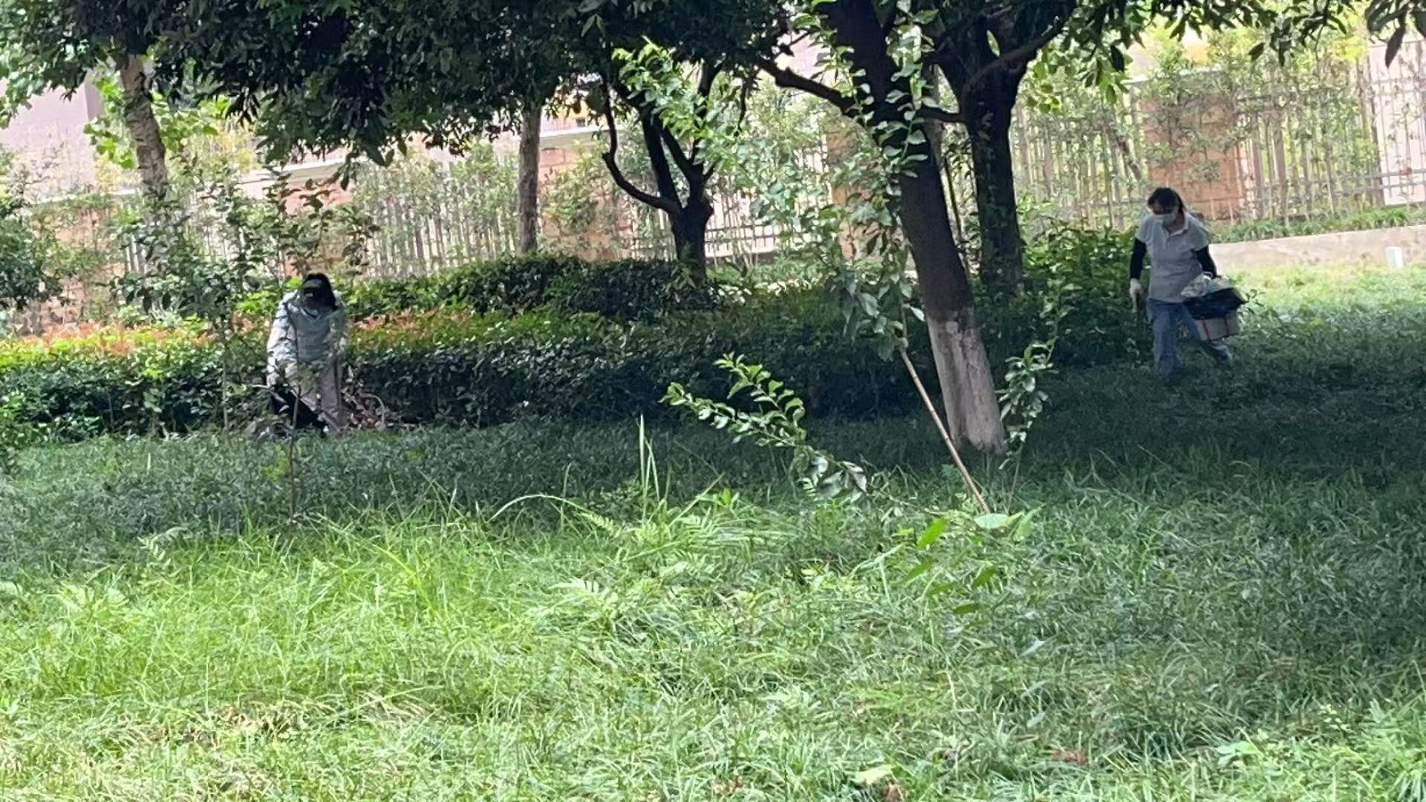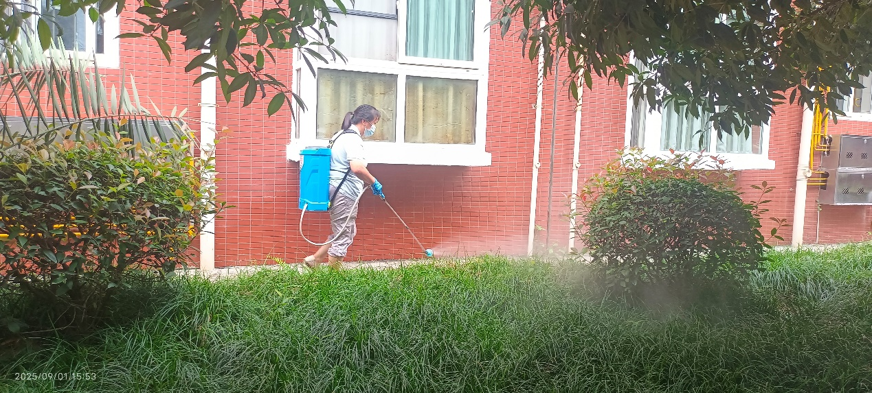 行动覆盖教学楼、图书馆、宿舍、食堂等人员密集区域,采取“地毯式排查 + 靶向式清理”:拉网排查积水洼地、下水道、垃圾站、竹林等孳生重点区域,清除闲置容器内的积水、卫生死角的杂物,从源头切断蚊虫繁殖路径;对绿化带、湖区、雨篦子等易聚集区域,规范开展滞留喷洒,严控药剂浓度、规范流程,兼顾师生健康与校园生态安全。