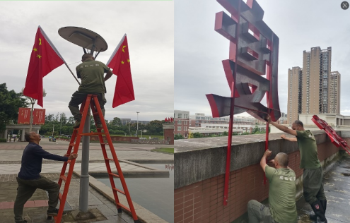氛围布置完成后,维护工作随即跟上。大风天气导致校园主干道部分国旗出现歪斜。物业服务中心立即启动应急响应,建立动态巡查机制:随时发现、随时扶正、随时加固。
