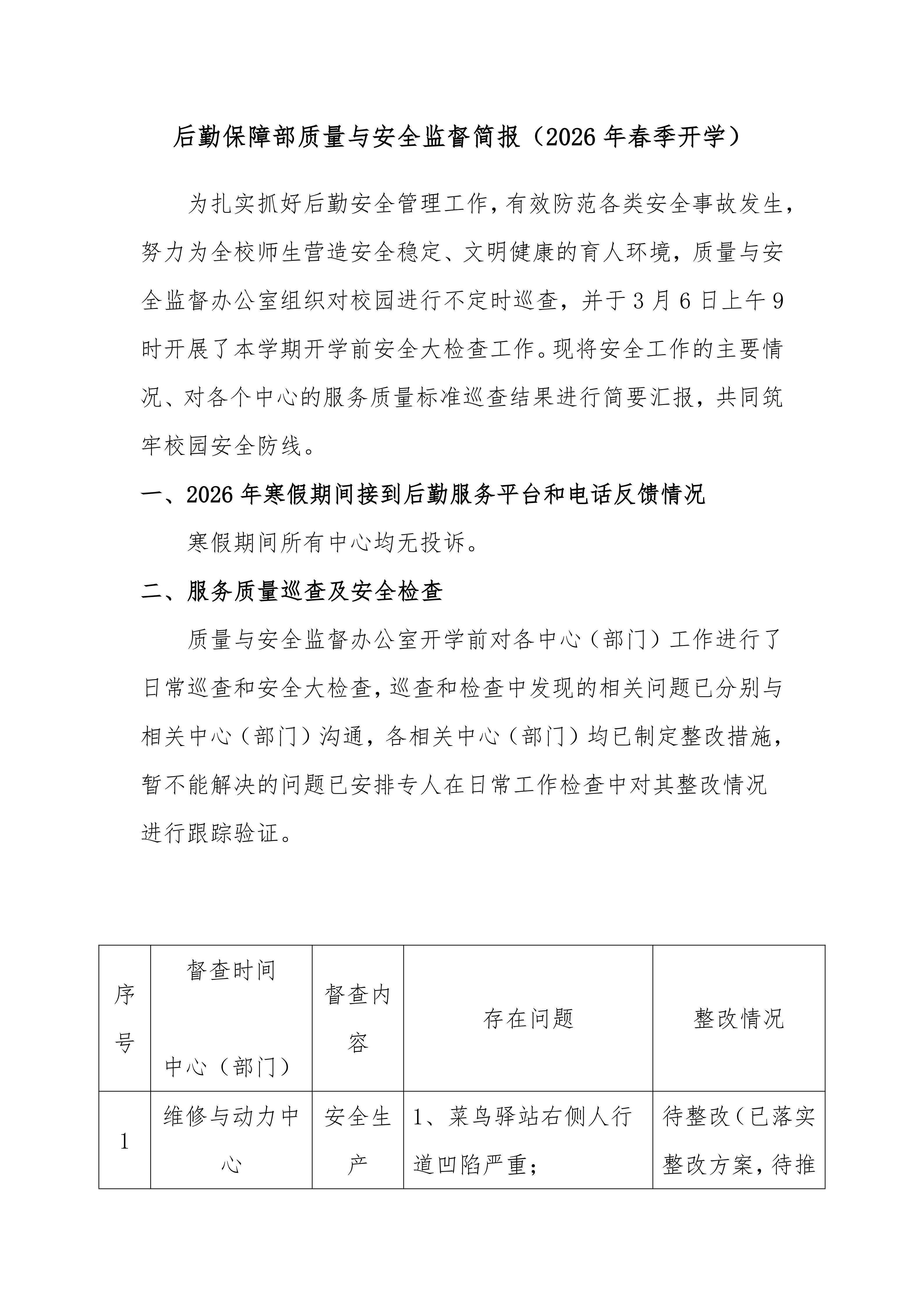 后勤保障部质量与安全监督简报(2026年春季开学)