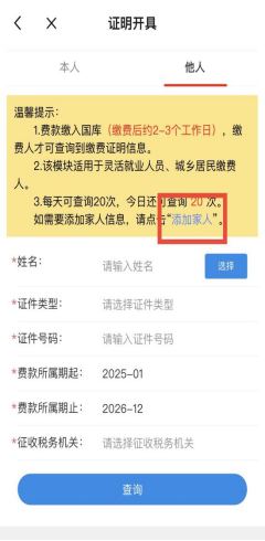 首选需绑学生基础信息,进入【证明开具】模块,若去年已经添加了家人信息就可以直接选择家人信息进行代开,若去年未绑定需点击“添加家人”完成添加后再进行代开。