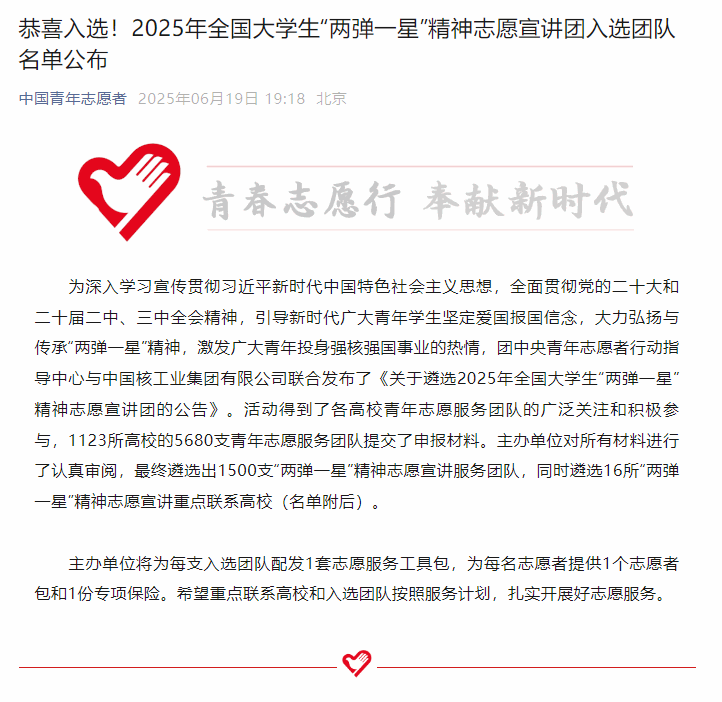 据悉,2025年全国大学生“两弹一星”精神志愿宣讲活动旨在深入学习宣传贯彻习近平新时代中国特色社会主义思想,全面贯彻党的二十大和二十届二中、三中全会精神,引导新时代广大青年学生坚定爱国报国信念,大力弘扬与传承“两弹一星”精神,激发广大青年投身强核强国事业的热情。活动得到全国各高校青年志愿服务团队的广泛关注和积极参与,共有1123所高校的5680支青年志愿服务团队提交了申报材料,经主办单位评审,最终遴选出1500支“两弹一星”精神志愿宣讲服务团队。