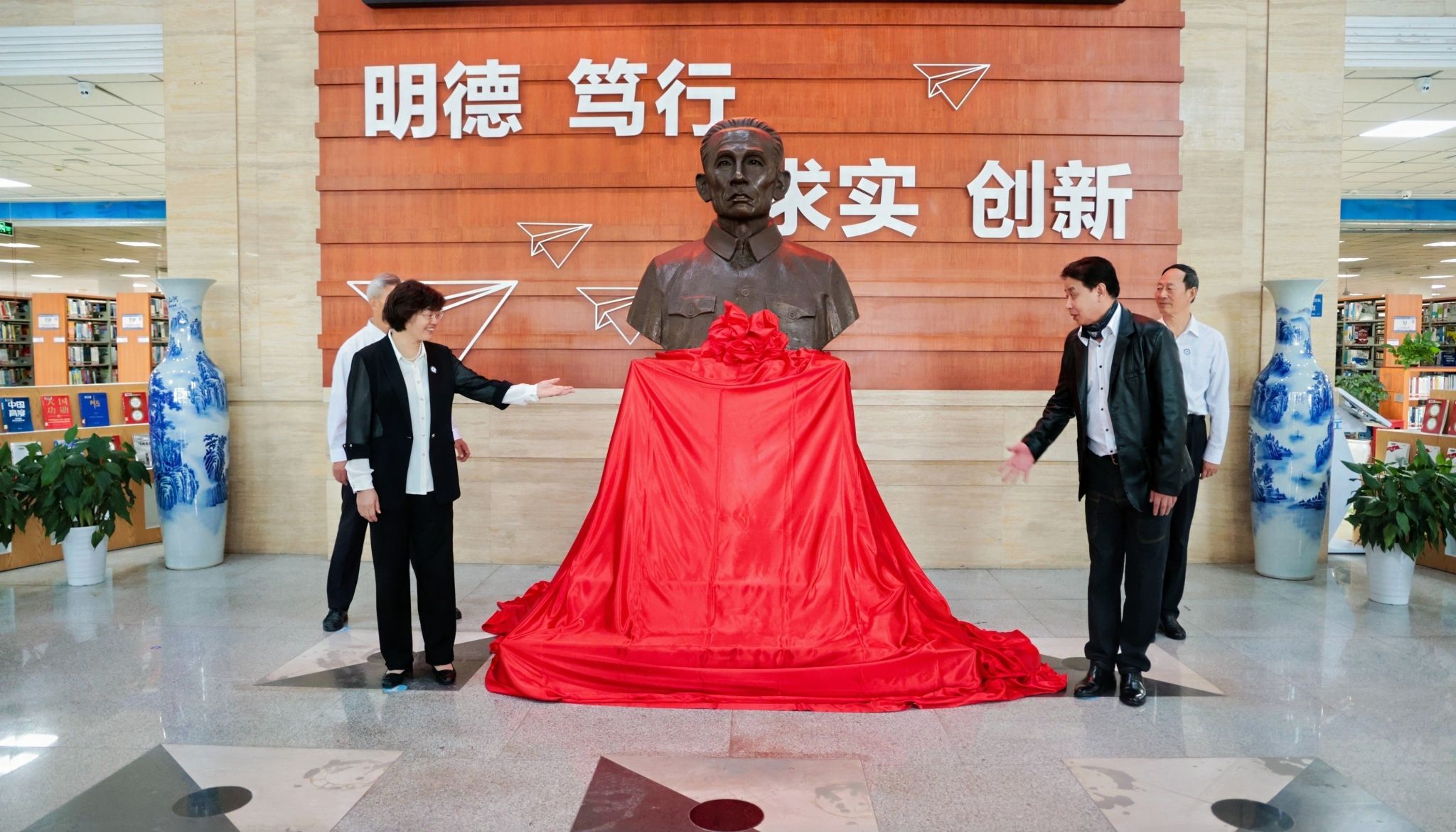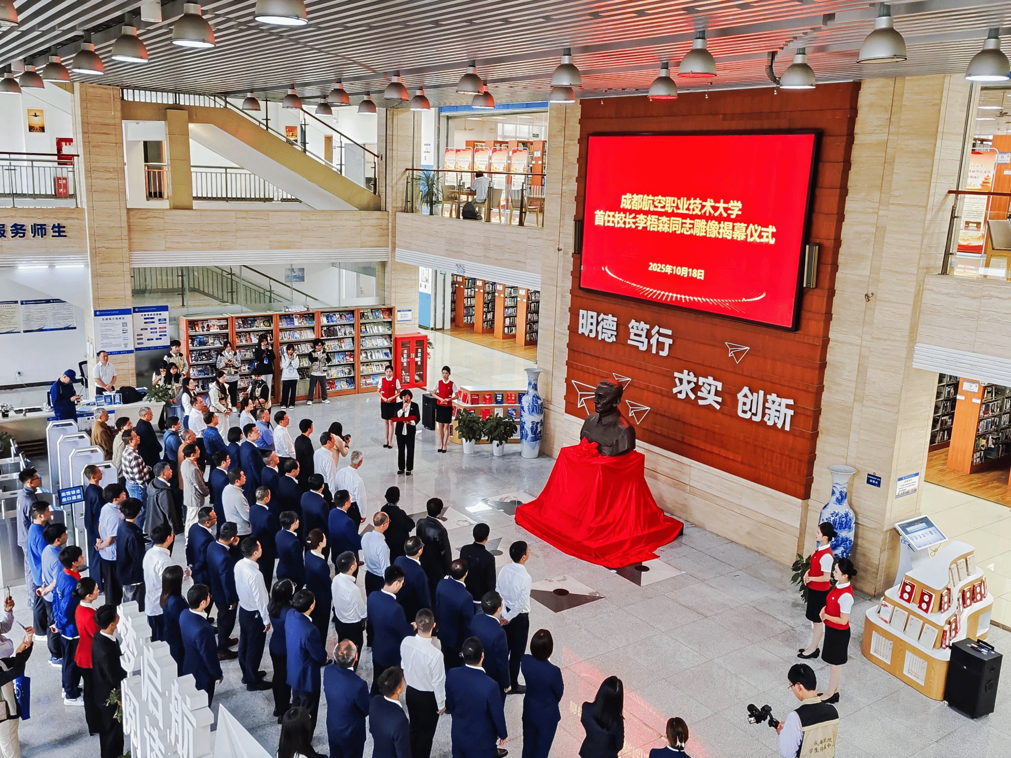 10月18日上午,成都航空职业技术大学首任校长李梧森同志雕像揭幕仪式在学校图书馆大厅顺利举行,原成都航空职业技术学院党委书记陈小红、副院长熊熙、纪委书记张洁、党委副书记祝登义、副院长李静森,学校老领导符安轼、王德位,李梧森校长的女儿李湘萍、儿子李阳、外孙张翰池出席仪式,各单位(部门)负责人、教师代表参加仪式。仪式由张洁主持。