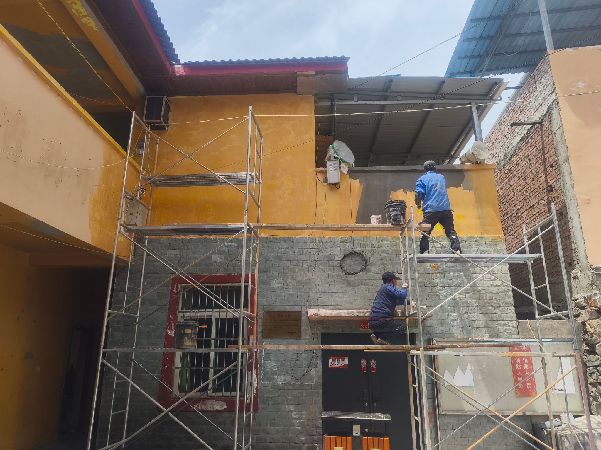 经过前期调研,本次共有800平方米以上的外墙需要进行喷漆翻新,同时,为了保证党群活动中心设备的正常工作,对相关广播设备进行了保护,同时对外墙破损处进行了维修。