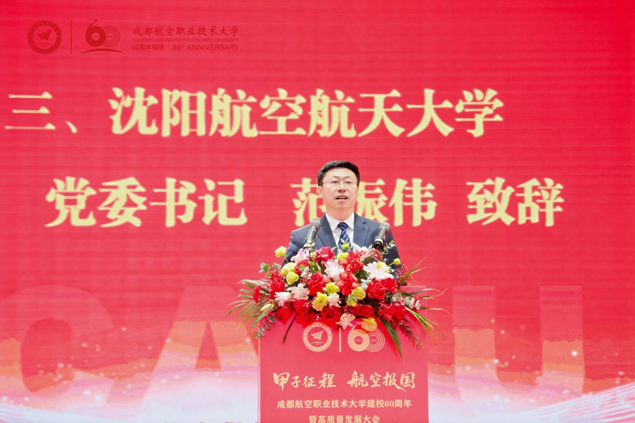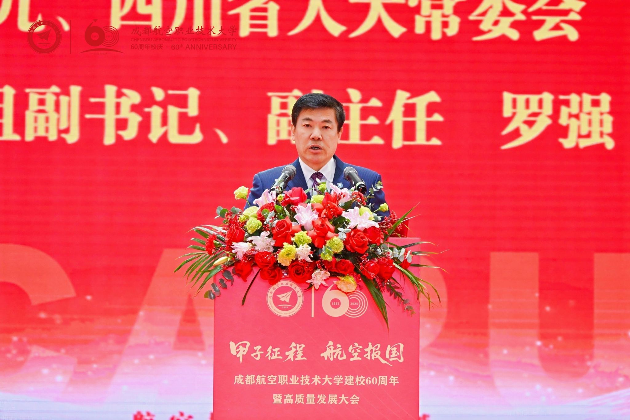 四川省人大常委会党组副书记、副主任罗强;中国航空工业集团有限公司董事、党组副书记李清堂;中共四川省委教育工委书记,教育厅党组书记、厅长陈冠松;中国航空工业集团有限公司总经理助理、党组干部部/人力资源部部长钱雪松;成都飞机工业(集团)有限责任公司党委书记、董事长隋少春;成都飞机设计研究所所长姜兵;四川省人大教科文卫委副主任委员黄勇;四川省委军民融合发展委员会二级巡视员徐世光;四川省科技厅一级巡视员杨品华;四川省应急管理厅二级巡视员高飞;四川省中华职业教育社主任王小晴;西北工业大学原党委副书记、校务委员会副主任万小朋;南京航空航天大学党委常委、副校长黄志球;沈阳航空航天大学(简称:沈航)党委书记范振伟;中国民航大学党委常委、纪委书记罗黎明;中国民用航空飞行学院党委常委、副院长方涛;西南石油大学党委副书记丁林;成都市委教育工委专职副书记、市教育局党组成员杨莉;成都市经开区党工委书记、龙泉驿区委书记邱向东,以及其他来自行业组织、部队、合作企业、兄弟院校、新闻媒体等社会各界近1200人出席大会,共庆学校60华诞,共忆学校璀璨荣光,共祝学校再谱新篇。大会由成都航空职业技术大学党委书记陈小红主持。
