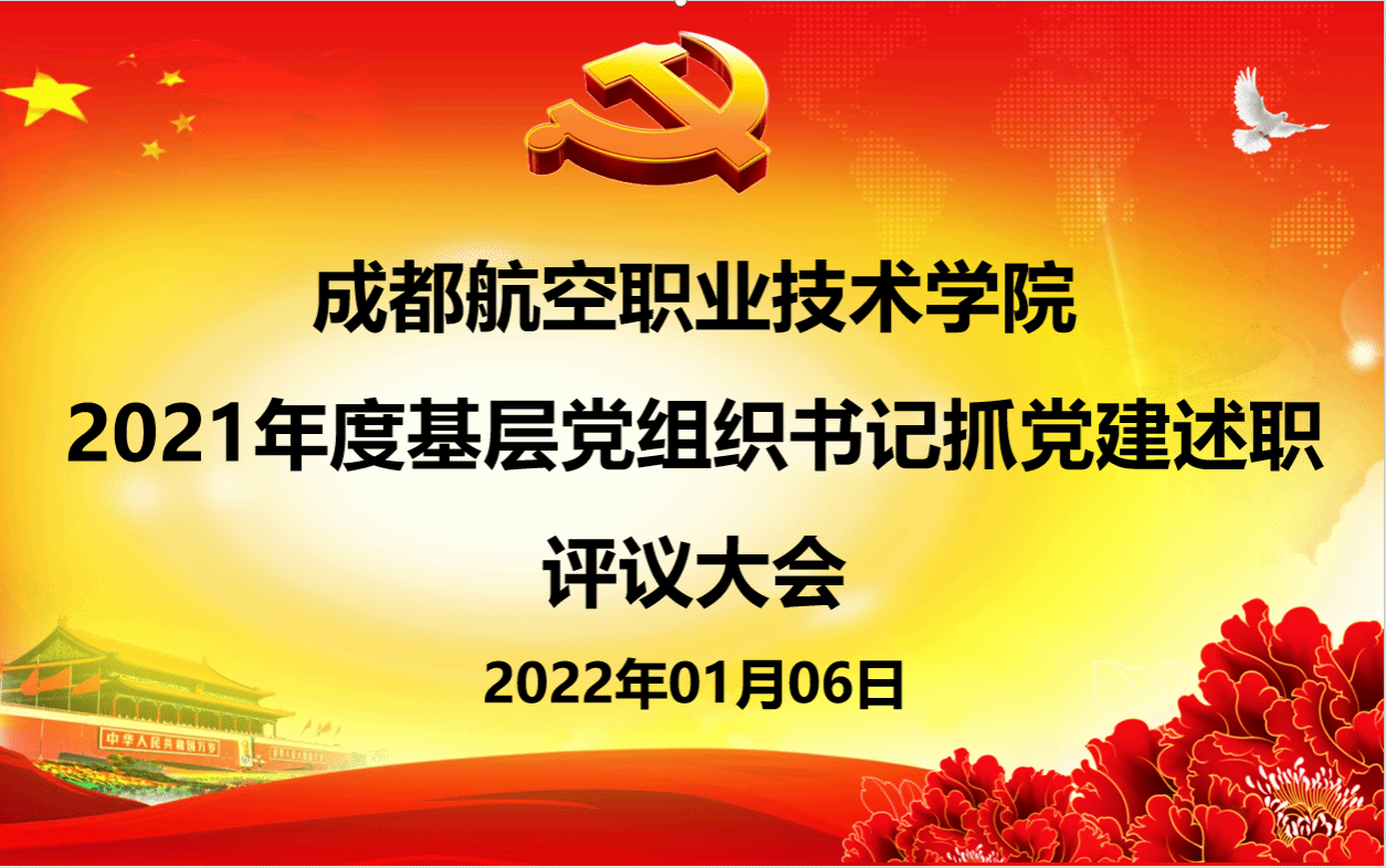 为深入学习贯彻习近平新时代中国特色社会主义思想和党的十九大、十九届历次全会精神,按照新时代党的建设总要求,扎实推进全面从严治党向基层延伸,根据上级要求部署,2022年1月6日,成都航空职业技术学院2021年度基层党组织书记抓党建述职评议考核大会在图书馆三楼报告厅举行。校党委书记陈小红,校长刘建超,校党委副书记陈玉华,校党委常委、副校长熊熙,校党委常委、纪委书记张洁,校党委常委、副校长周锦峰出席会议。各部门党政负责同志,各党总支负责人,各党支部书记,部分“两代表一委员”和教师党员代表参加述职评议大议。会议由陈玉华主持。