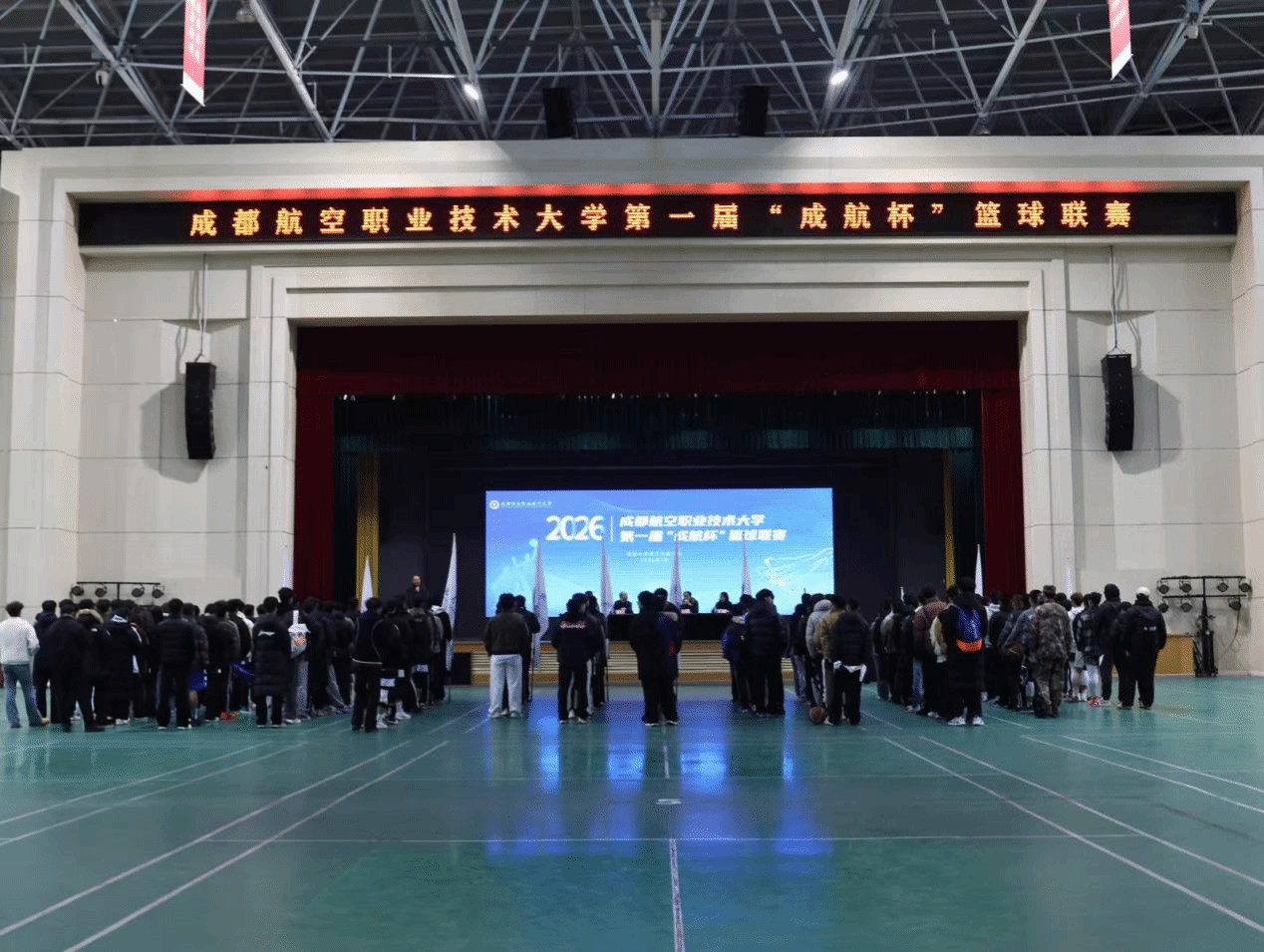 青春逐梦,篮场竞辉。为丰富校园文化生活,践行五育并举育人理念,2026年1月4日,成都航空职业技术大学首届“成航杯”篮球联赛开幕式在龙泉驿校区文体馆举行,成都航空职业技术大学党委副书记谢亮冯出席开幕式并致辞。党委学生工作部、团委、体育教学部等部门负责人,以及赛事组委会的各位负责老师、各学院师生代表、全体参赛队员及裁判员齐聚现场,共同见证这场属于成航学子的体育盛事启幕。