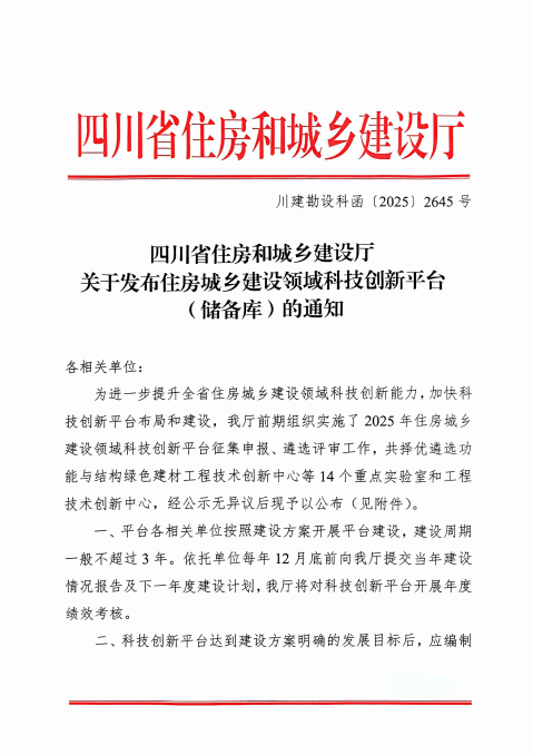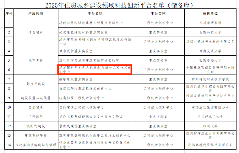 近日,四川省住房和城乡建设厅官网公示了2025年住房城乡建设领域科技创新平台(储备库)名单,由成都航空职业技术大学联合中国建筑西南设计研究院有限公司、四川华测建信检测技术有限公司共同申报的“建筑围护结构无人机检测与维护工程技术创新中心”成功入选。四川省住房和城乡建设厅召开住房城乡建设领域科技创新平台座谈会,对包括该中心在内的14个获批平台的建设推进工作提出指导要求,标志着学校在城市更新领域产学研协同创新工作进入实质推进阶段,将为全省城市更新行动提供强有力的技术支撑与人才保障。