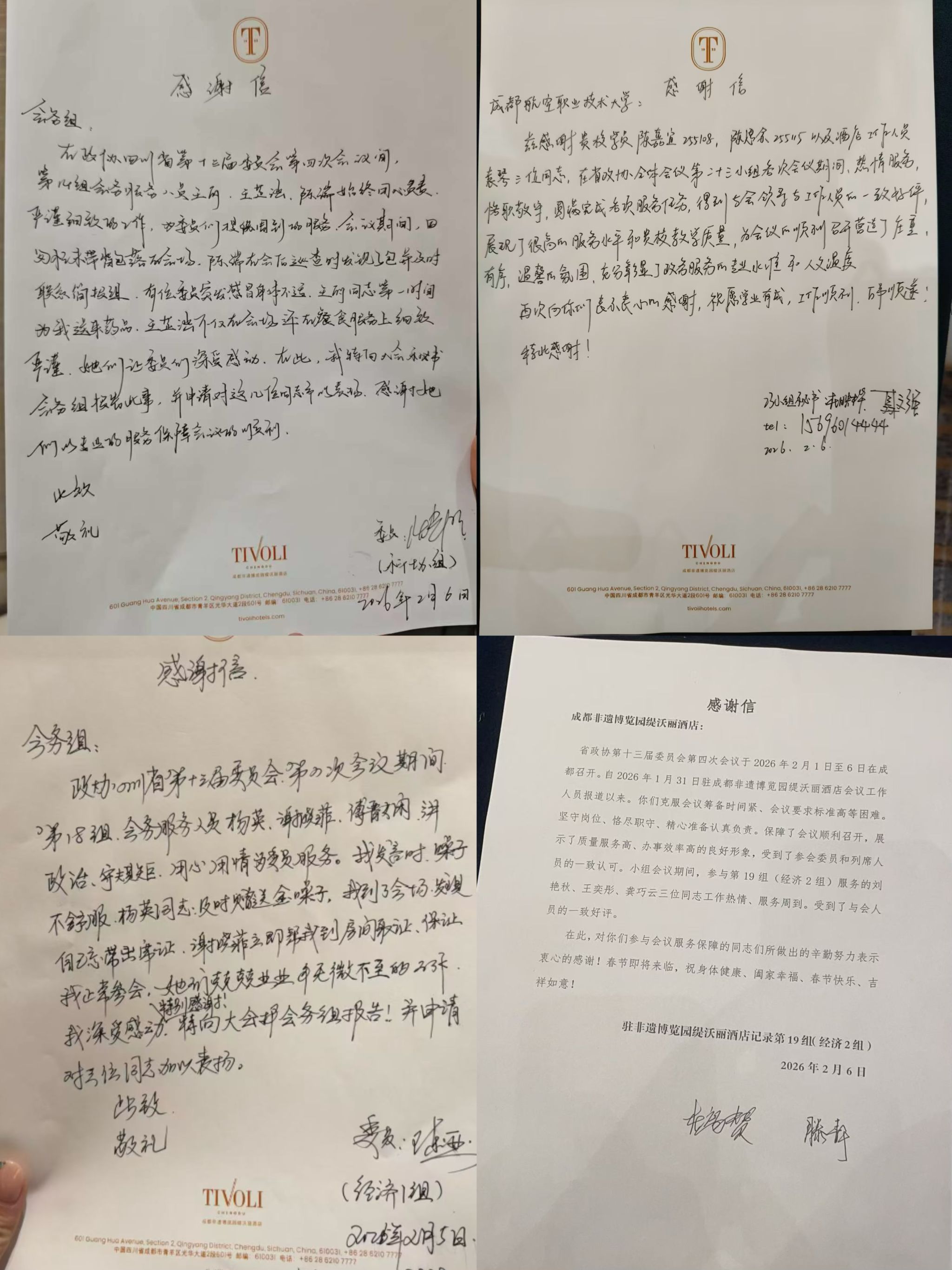 在刚落下帷幕的省政协十三届第四次会议(2月2日—2月6日)中,成都航空职业技术大学32名青年学子圆满完成本次会议服务保障任务,以规范的礼仪、精湛的技能和饱满的热情,赢得了参会委员的赞誉,部分委员还特意手写感谢信,为这群青春身影点赞。这已是成航学子连续第三年站上省政协会议服务岗位,用实践行动诠释青年学子的责任与担当,彰显职业教育实践育人的丰硕成果。