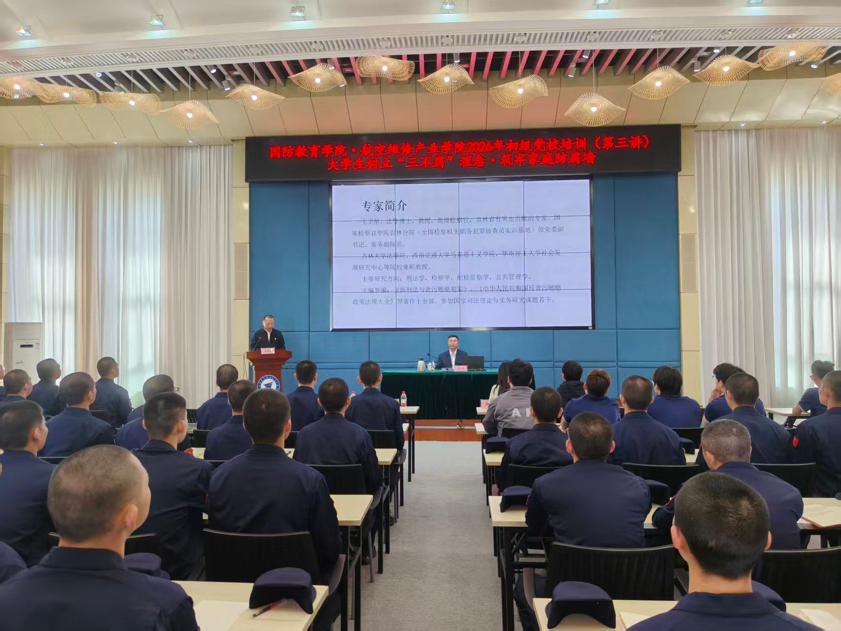 为切实加强入党积极分子的教育培养工作,筑牢拒腐防变的思想道德防线,引导青年学子从源头上树立清正廉洁的价值观念,进一步树立和践行正确政绩观,成都航空职业技术大学航空维修产业学院、国防教育学院2026年第一期入党积极分子培训班第三次党课在学校求实报告厅顺利举行。本次党课邀请国家检察官学院吉林分院(全国检察机关职务犯罪侦查员实训基地)原党委副书记、常务副院长王卫星教授,以“大学生树立‘三不腐’理念,筑牢家庭防腐墙”进行主题授课。培训会由成航党委副书记谢亮冯主持,航空维修产业学院、国防教育学院120余名学员参加本次学习。