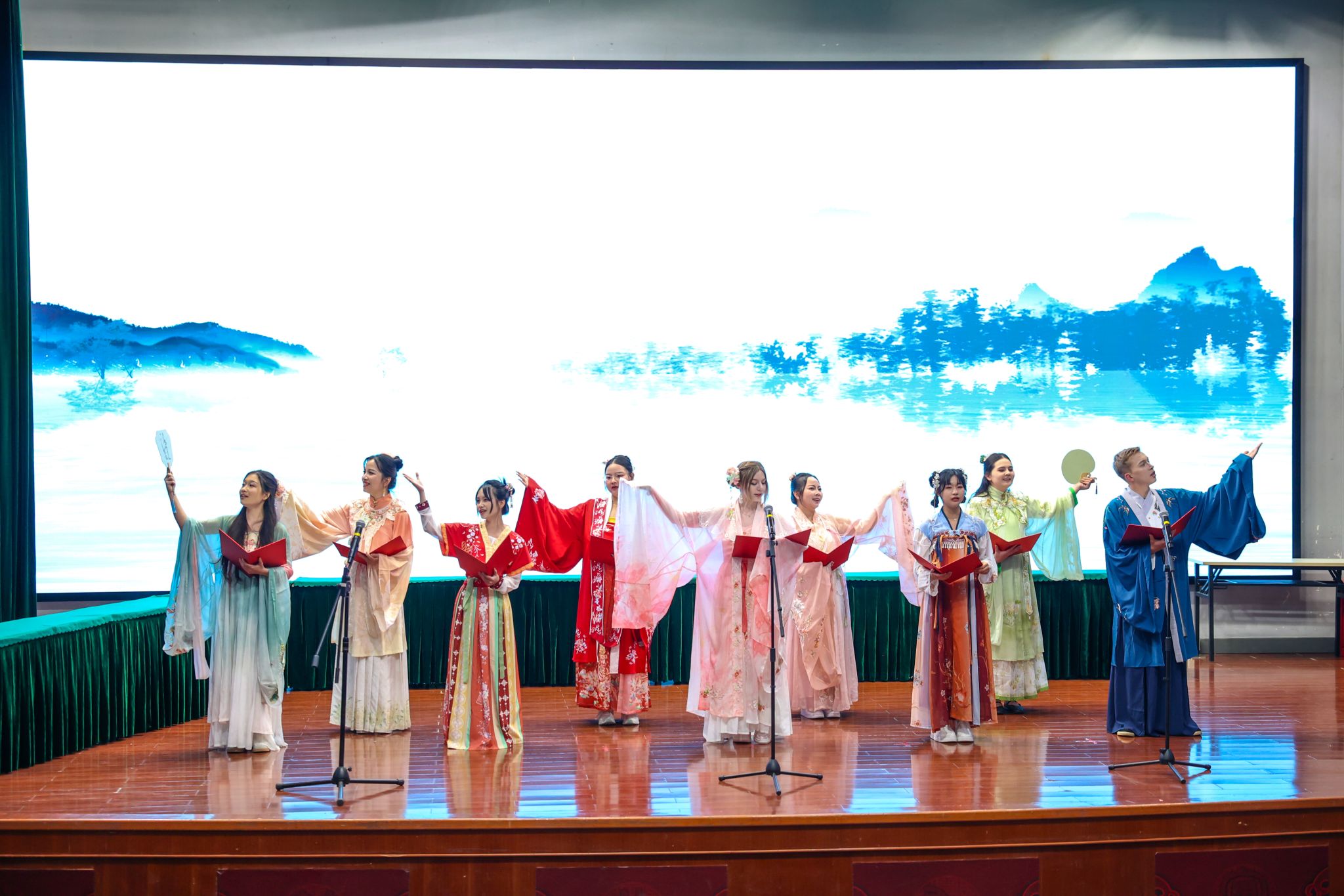 作为开幕式的重头戏,第五届诗词大赛随即开赛。来自11个学院的代表队同台竞技,选手们沉着应战,对答如流,展现出成航学子扎实的人文素养和昂扬的青春风采。经过“流连承韵”“勇阶撷华”“险中夺魁”“巅峰问鼎”四个环节激烈比拼,航空装备制造产业学院“翼宸队”、民航运输学院“诗韵队”并列夺得桂冠。国际教育学院留学生深情演绎的经典名篇《春江花月夜》荣获特邀表演奖。