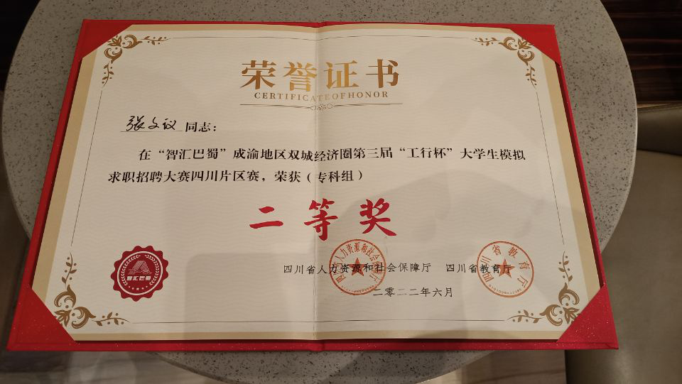 6月9日-10日,以“筑梦巴蜀·赢在职场”为主题的智汇巴蜀·成渝地区双城经济圈第三届“工行杯”大学生模拟求职招聘大赛四川赛区决赛在成都成功落幕。我校管理学院学生张文议发挥出色,取得专科组总分第三名,荣获二等奖。