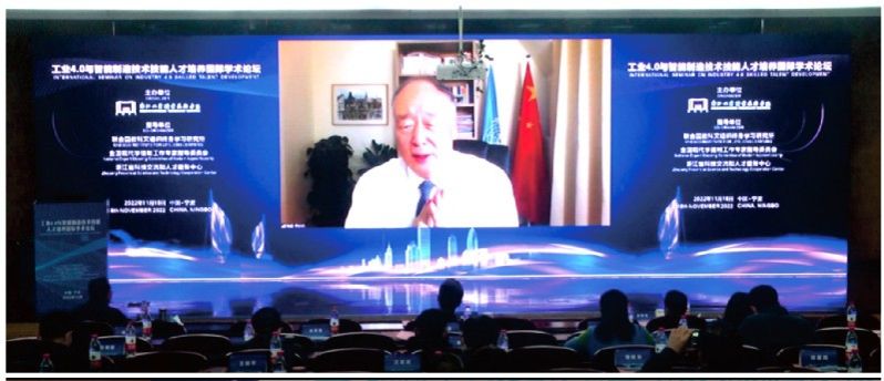 本次国际学术论坛在联合国教科文组织终身学习研究所、全国现代学徒制工作专家指导委员会、浙江省科技交流和人才服务中心等单位的指导下,采用线上线下相结合的形式,邀请了联合国教科文组织终身学习研究所所长戴维•阿乔莱那(David Atchoarena)、中国常驻联合国教科文组织代表团大使衔代表杨进、教育部职业教育发展中心副主任黄辉、浙江省科技交流和人才服务中心主任张要武、宁波市职业技术教育学会会长沈剑光,以及来自德国、韩国、日本和国内科研院所、各院校领导、专家,共同就“工业4.0”背景内涵、智能制造领域发展现状和技术技能人才培养等进行交流分享。会议上下半场分别由浙江工商职业技术学院教师、宁波市影视产业协会秘书长刘昊和宁波市职业技术教育学会会长沈剑光主持。