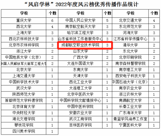 12月21日,中国科学技术协会风启学林官方网站公布了《2022年度风云榜》,成都航院“忠诚奉献,逐梦蓝天”航空报国精神学风系列传播项目创作的3支视频上榜,和来自清华大学、北京大学等100个作品一起被评为优秀传播作品。