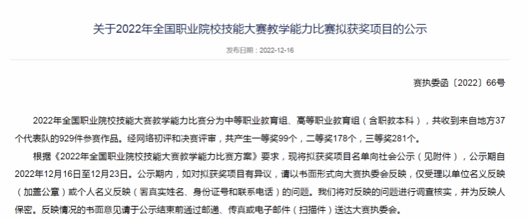 近年来,学校不断加大教师教学比赛团队的培育和指导,2022年省赛中我校共推荐11件作品,共6件作品获奖,其中一等奖2项、三等奖4项。今后,学校将继续强化教师教学能力培养,坚持立德树人,深化“三教”改革,探索“岗课赛证”综合育人,不断提升教育教学水平和人才培养质量。
