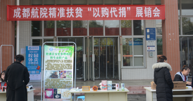 2019年12月10日,校工会、校精准扶贫办公室通过以购代捐方式先后在校内小航爱心扶贫店和老校区——成航苑,举办了对口帮扶四川阿坝州茂县唱斗村、松潘县纳坡村以及凉山州雷波县和我校贫困学生家庭的农特产品展销活动。产品主要为对口帮扶地的农特产品,包含松潘新鲜牦牛肉、羊肉、牛肉干、高山土豆、蒲公英茶、茂县土鸡、雷波紫山药、腊肉、蜂蜜等20余种产品。